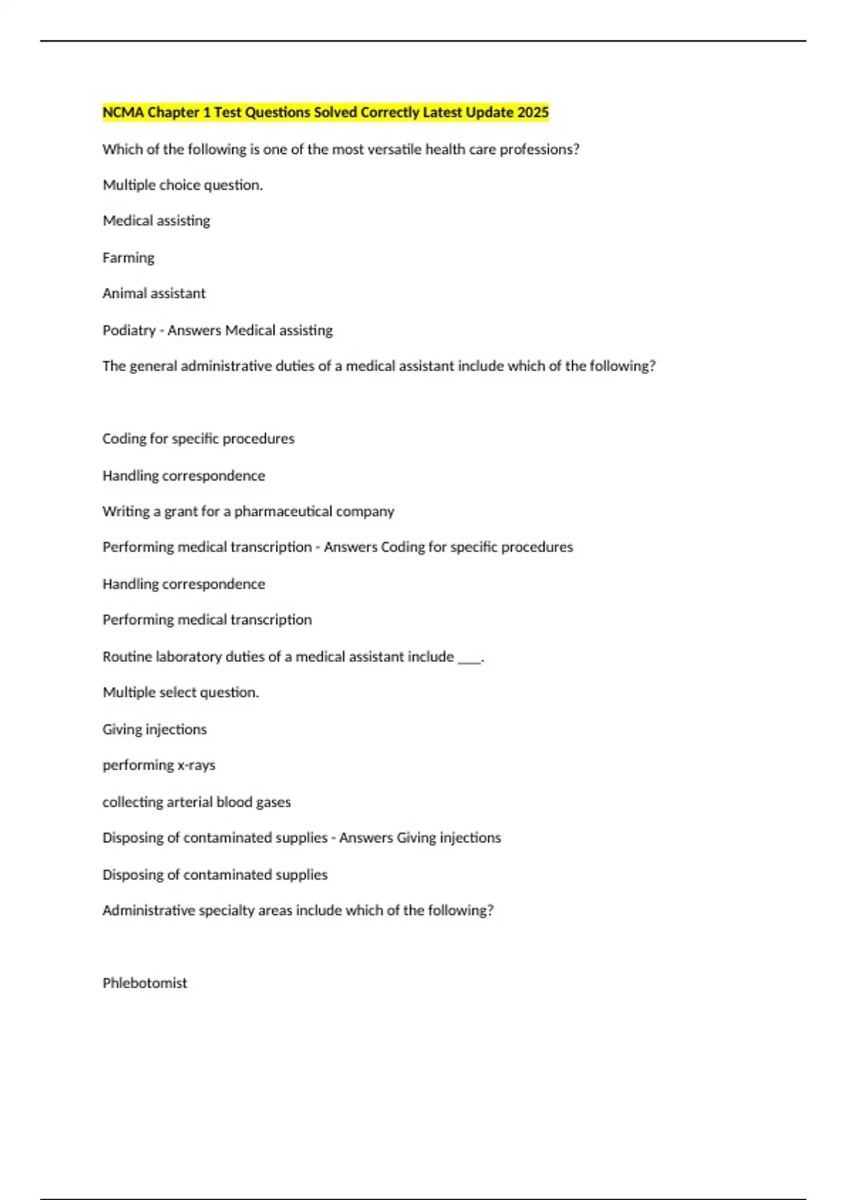 NCMA Chapter 1 Test Questions Solved Correctly Latest Update 2025 Which of the following is one of the most versatile health care professions? Multiple choice question. Medical assisting Farming Animal assistant Podiatry - Answers Medical assisting The general administrative duties of a medical assistant include which of the following? Coding for specific procedures Handling correspondence Writing a grant for a pharmaceutical company Performing medical transcription - Answers Coding for specific procedures Handling correspondence Performing medical transcription Routine laboratory duties of a medical assistant include ___. Multiple select question. Giving injections performing x-rays collecting arterial blood gases Disposing of contaminated supplies - Answers Giving injections Disposing of contaminated supplies Administrative specialty areas include which of the following? Phlebotomist Medical office administrator Physical therapy assistant Histologic technician - Answers Medical office administrator What type of professionals do ophthalmic medical assistants help? Multiple choice question. Neurologists Ophthalmologists Gynecologists Urologists - Answers Ophthalmologists According to the U.S. Department of Labor, medical assisting is one of the 10 fastest growing ______. Multiple choice question. industries activities occupations records - Answers occupations What are the characteristics of a solid medical assisting program? Facilities and equipment that are outdated Job placement services Guarantee of wages after completion Opportunities for continuing education - Answers -Job placement services -Opportunities for continuing education Which of the following is an administrative duty of the medical assistant? Multiple choice question. Ordering lab tests Performing a CT scan Organizing office supplies Prescribing medications - Answers Organizing office supplies Which of the following are considered clinical duties of the medical assistant? Multiple select questions. Preparing examination and treatment areas Handling correspondence Performing diagnostic tests