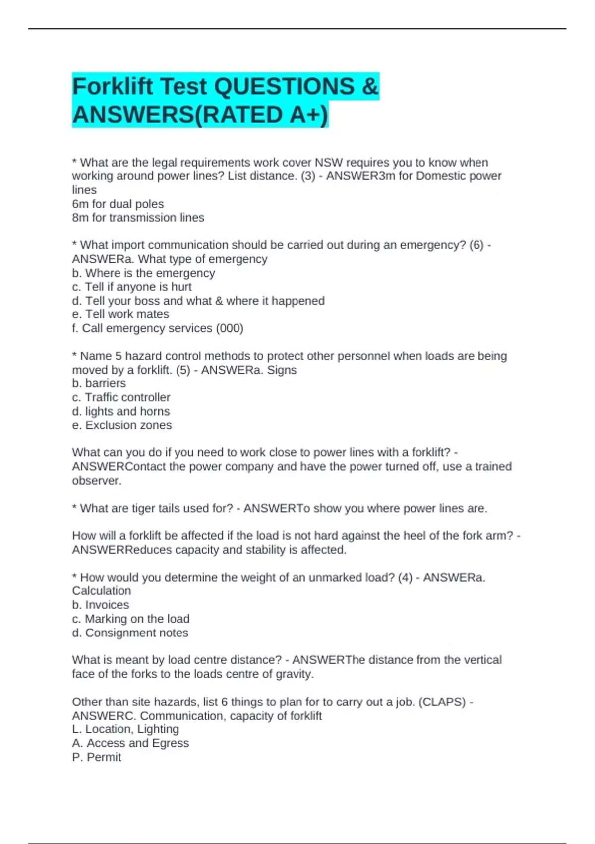 * What are the legal requirements work cover NSW requires you to know when working around power lines? List distance. (3) - ANSWER3m for Domestic power lines 6m for dual poles 8m for transmission lines * What import communication should be carried out during an emergency? (6) - ANSWERa. What type of emergency b. Where is the emergency c. Tell if anyone is hurt d. Tell your boss and what & where it happened e. Tell work mates f. Call emergency services (000) * Name 5 hazard control methods to protect other personnel when loads are being moved by a forklift. (5) - ANSWERa. Signs b. barriers c. Traffic controller d. lights and horns e. Exclusion zones What can you do if you need to work close to power lines with a forklift? - ANSWERContact the power company and have the power turned off, use a trained observer. * What are tiger tails used for? - ANSWERTo show you where power lines are. How will a forklift be affected if the load is not hard against the heel of the fork arm? - ANSWERReduces capacity and stability is affected. * How would you determine the weight of an unmarked load? (4) - ANSWERa. Calculation b. Invoices c. Marking on the load d. Consignment notes What is meant by load centre distance? - ANSWERThe distance from the vertical face of the forks to the loads centre of gravity. Other than site hazards, list 6 things to plan for to carry out a job. (CLAPS) - ANSWERC. Communication, capacity of forklift L. Location, Lighting A. Access and Egress P. Permit