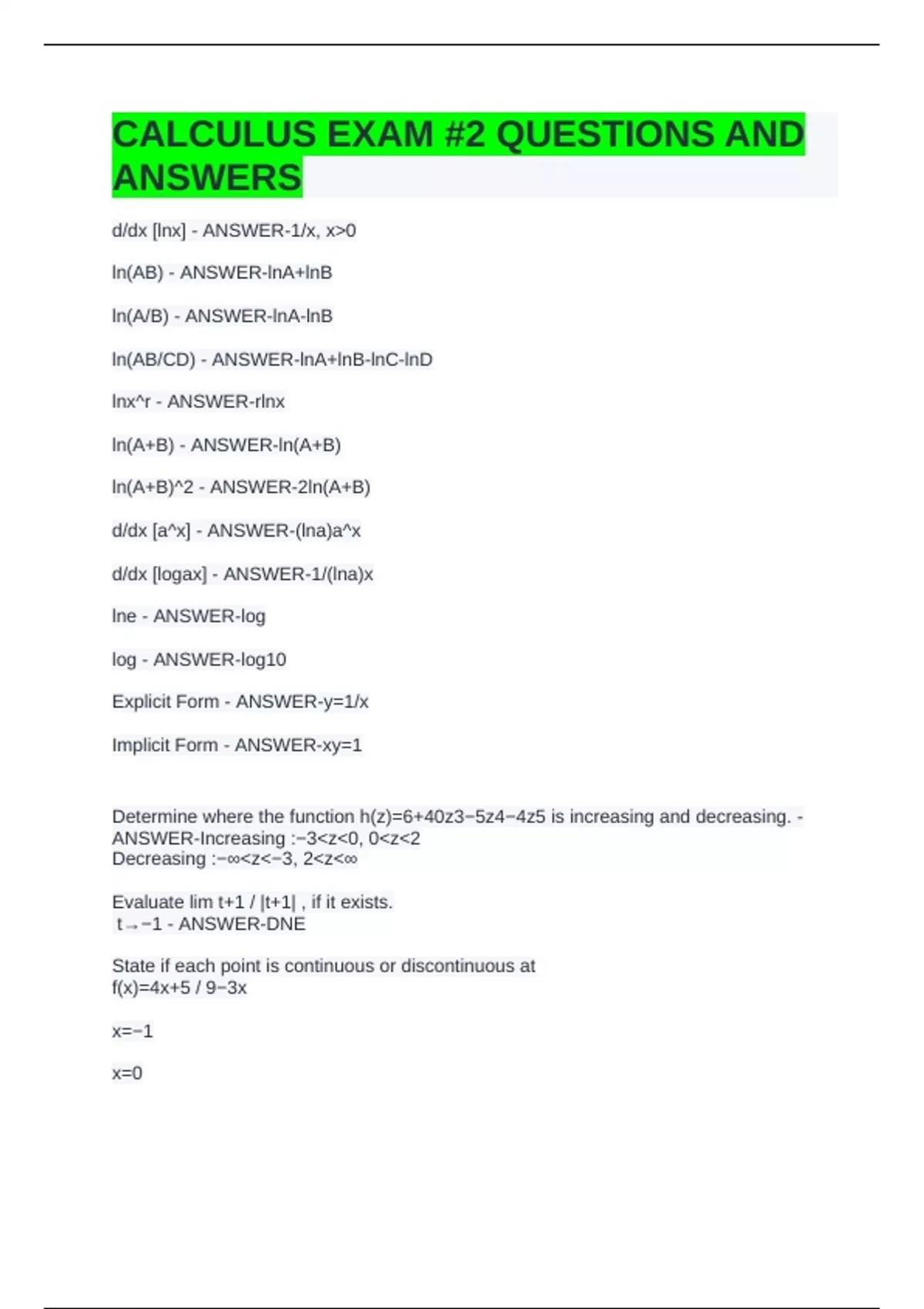 CALCULUS EXAM #2 QUESTIONS AND