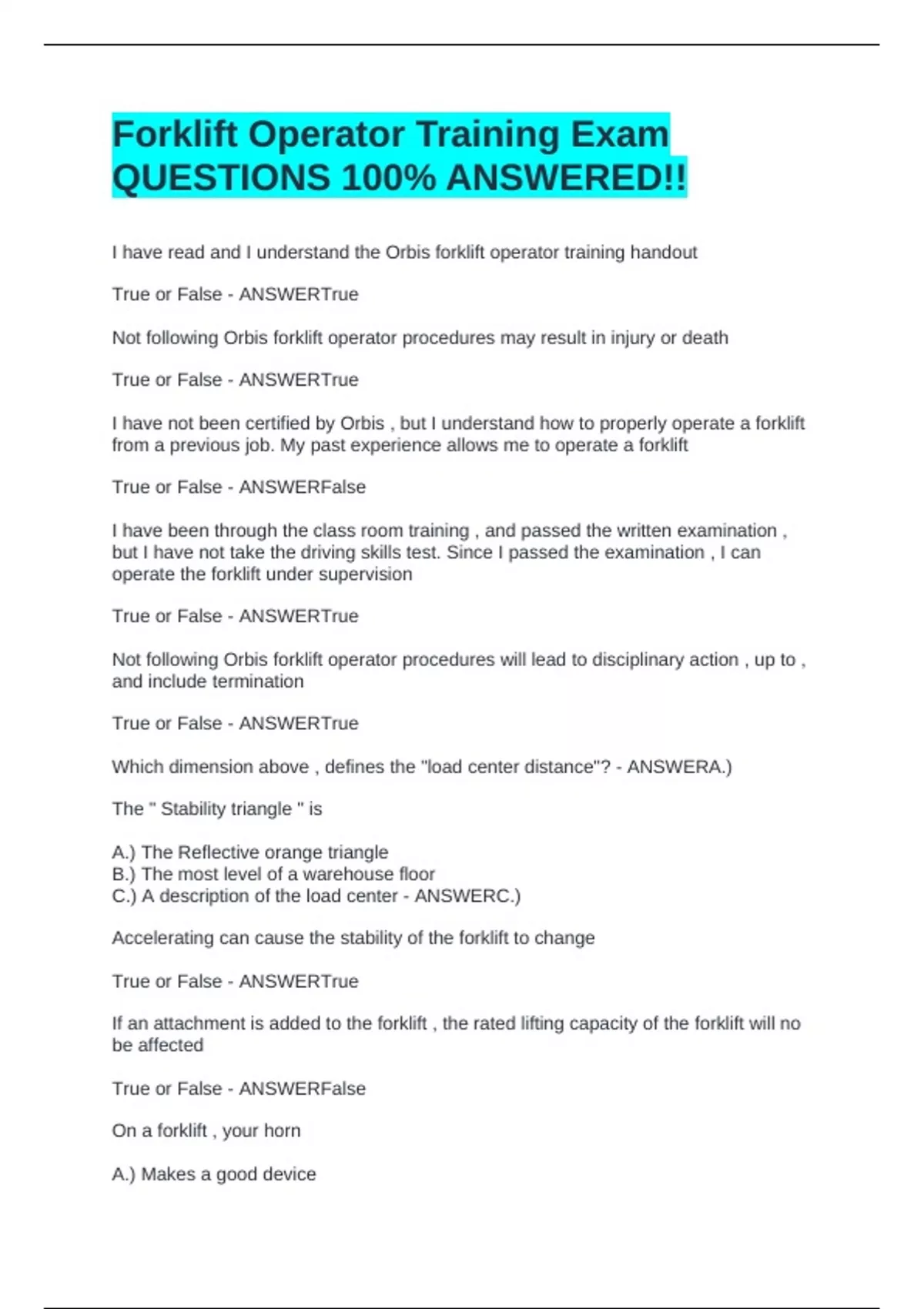 I have read and I understand the Orbis forklift operator training handout True or False - ANSWERTrue Not following Orbis forklift operator procedures may result in injury or death True or False - ANSWERTrue I have not been certified by Orbis , but I understand how to properly operate a forklift from a previous job. My past experience allows me to operate a forklift True or False - ANSWERFalse I have been through the class room training , and passed the written examination , but I have not take the driving skills test. Since I passed the examination , I can operate the forklift under supervision True or False - ANSWERTrue Not following Orbis forklift operator procedures will lead to disciplinary action , up to , and include termination True or False - ANSWERTrue Which dimension above , defines the "load center distance"? - ANSWERA.) The " Stability triangle " is A.) The Reflective orange triangle B.) The most level of a warehouse floor C.) A description of the load center - ANSWERC.) Accelerating can cause the stability of the forklift to change True or False - ANSWERTrue If an attachment is added to the forklift , the rated lifting capacity of the forklift will no be affected True or False - ANSWERFalse On a forklift , your horn A.) Makes a good device