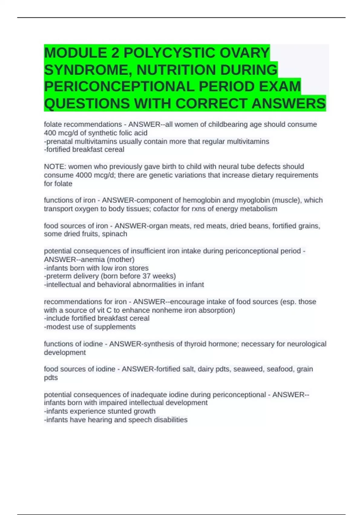 MODULE 2 POLYCYSTIC OVARY SYNDROME, NUTRITION DURING PERICONCEPTIONAL PERIOD EXAM QUESTIONS WITH CORRECT ANSWERS