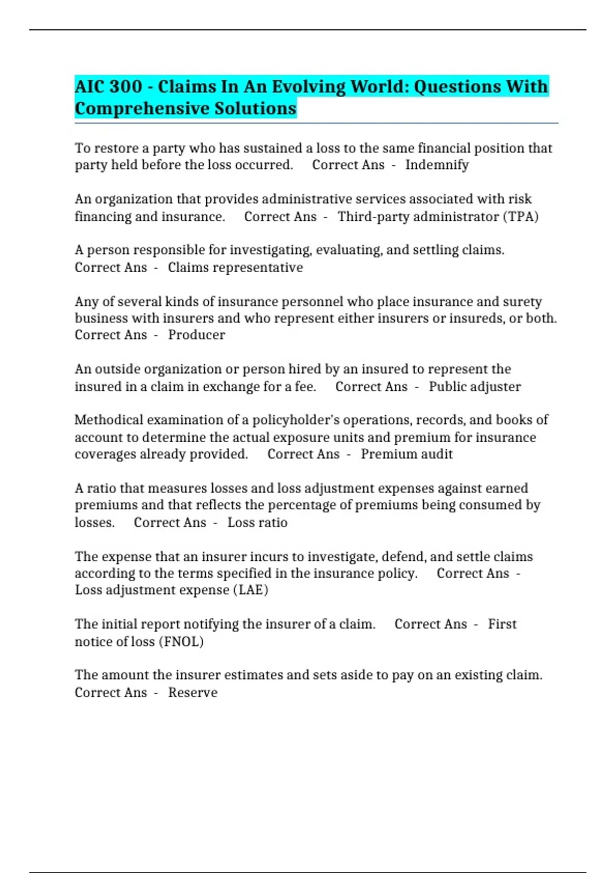 losses. Correct Ans - Loss ratio