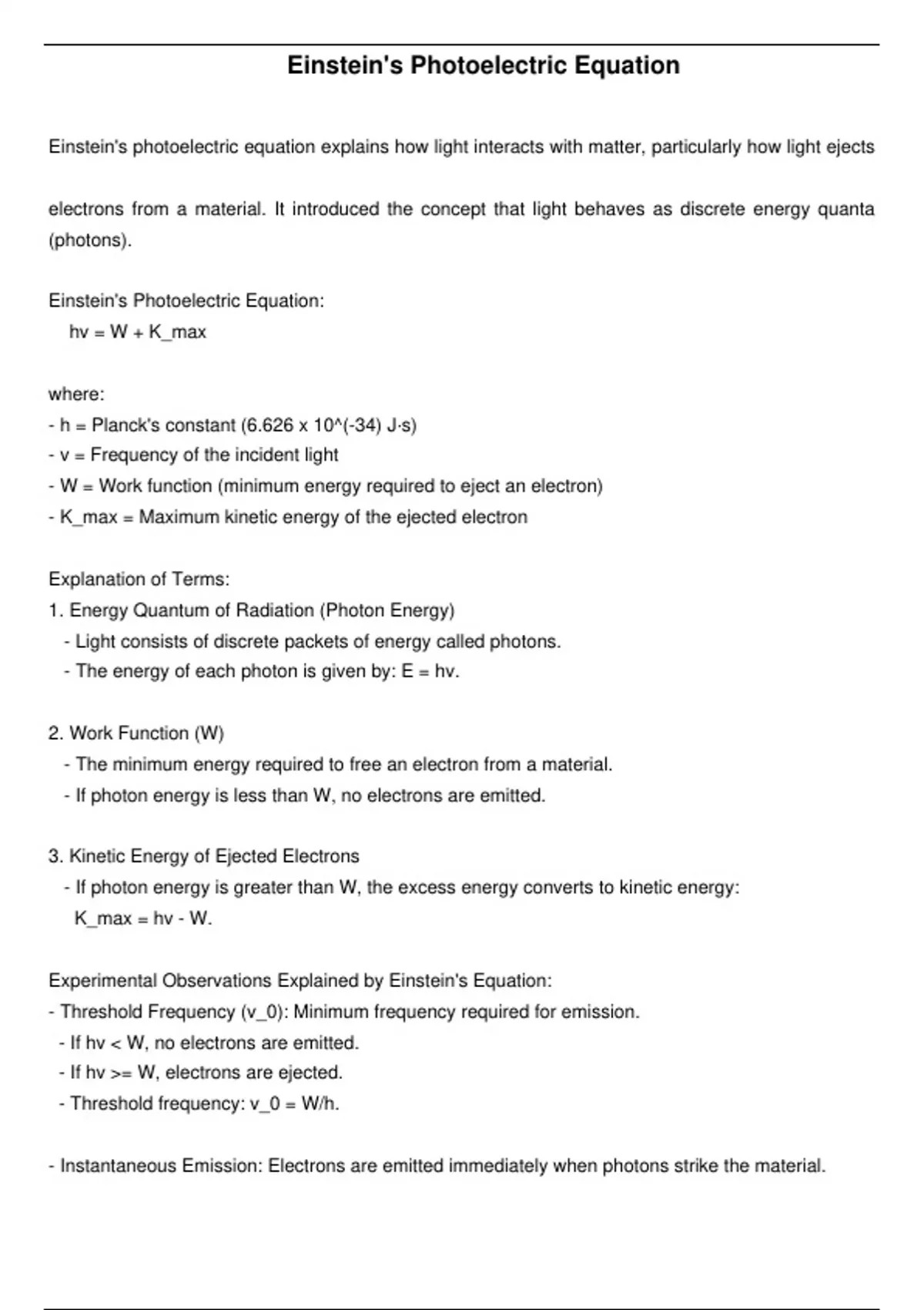 Einstein’s photoelectric equation explains the photoelectric effect, where light ejects electrons from a metal surface. The equation is: KE_{text{max}} = hnu - phi where is the maximum kinetic energy of emitted electrons, is Planck’s constant, is the light’s frequency, and (work function) is the minimum energy needed to eject an electron. If , no electrons are emitted. This equation proved that light behaves as particles (photons) and led to quantum mechanics. Applications include photoelectric cells, solar panels, and light sensors.