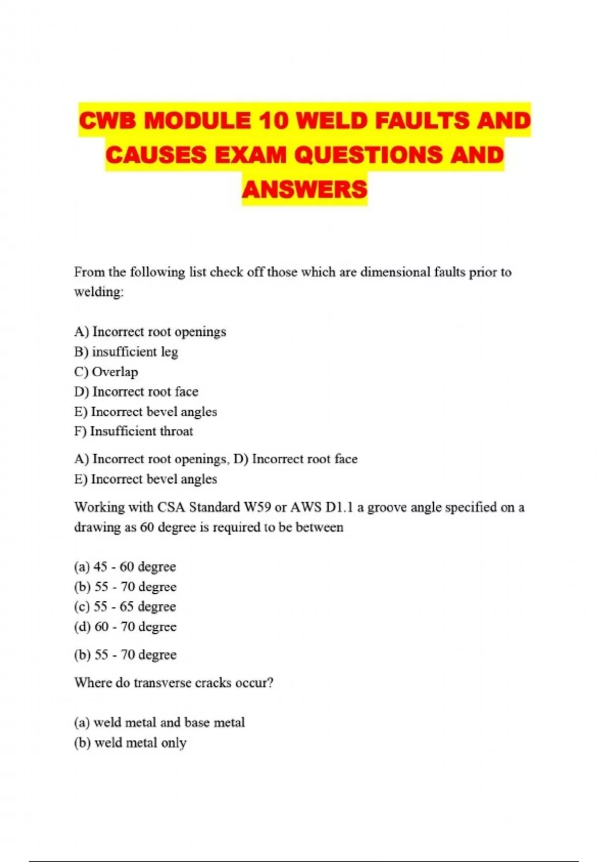 CWB MODULE 10 WELD FAULTS AND CAUSES EXAM QUESTIONS AND ANSWERS....