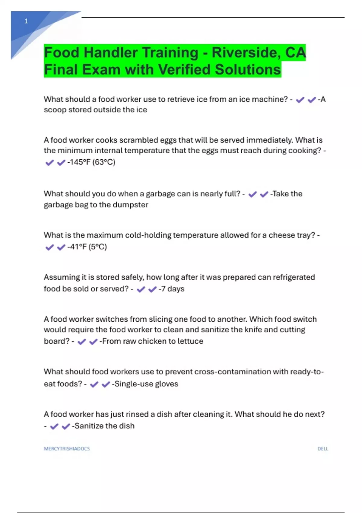Food Handler Training - Riverside, CA Final Exam with Verified Solutions What should a food worker use to retrieve ice from an ice machine? - -A scoop stored outside the ice A food worker cooks scrambled eggs that will be served immediately. What is the minimum internal temperature that the eggs must reach during cooking? - -145°F (63°C) What should you do when a garbage can is nearly full? - -Take the garbage bag to the dumpster What is the maximum cold-holding temperature allowed for a cheese tray? - -41°F (5°C) Assuming it is stored safely, how long after it wa