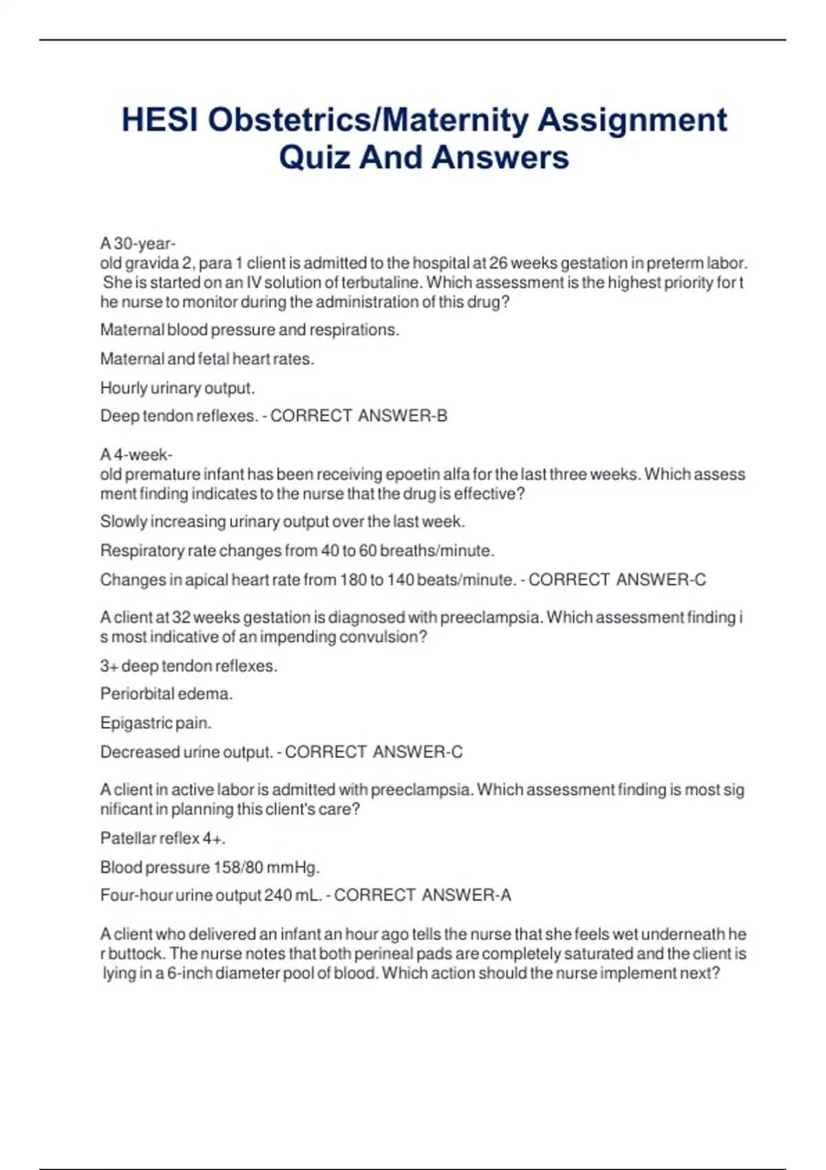 HESI Obstetrics/Maternity Assignment Quiz And Answers HESI Obstetrics/Maternity Assignment Quiz And Answers HESI Obstetrics/Maternity Assignment Quiz And Answers