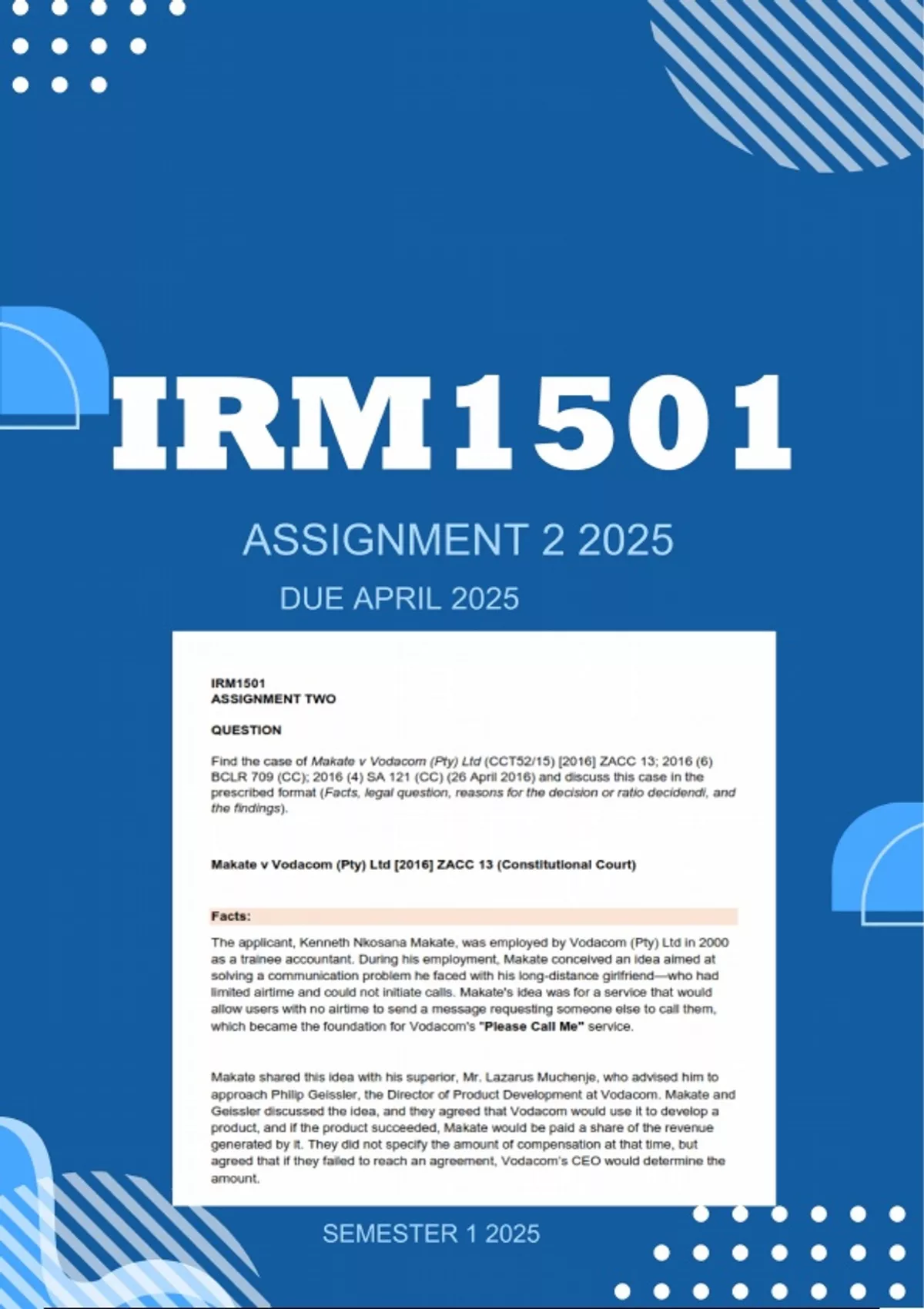 IRM1501 ASSIGNMENT TWO QUESTION Find the case of Makate v Vodacom (Pty) Ltd (CCT52/15) [2016] ZACC 13; 2016 (6) BCLR 709 (CC); 2016 (4) SA 121 (CC) (26 April 2016) and discuss this case in the prescribed format (Facts, legal question, reasons for the decision or ratio decidendi, and the findings). Makate v Vodacom (Pty) Ltd [2016] ZACC 13 (Constitutional Court) Facts: The applicant, Kenneth Nkosana Makate, was employed by Vodacom (Pty) Ltd in 2000 as a trainee accountant. During his employment, Makate conceived an idea aimed at solving a communication problem he faced with his long-distance girlfriend—who had limited airtime and could not initiate calls. Makate's idea was for a service that would allow users with no airtime to send a message requesting someone else to call them, which became the foundation for Vodacom's "Please Call Me" service. Makate shared this idea with his superior, Mr. Lazarus Muchenje, who advised him to approach Philip Geissler, the Director of Product Development at Vodacom. Makate and Geissler discussed the idea, and they agreed that Vodacom would use it to develop a product, and if the product succeeded, Makate would be paid a share of the revenue generated by it. They did not specify the amount of compensation at that time, but