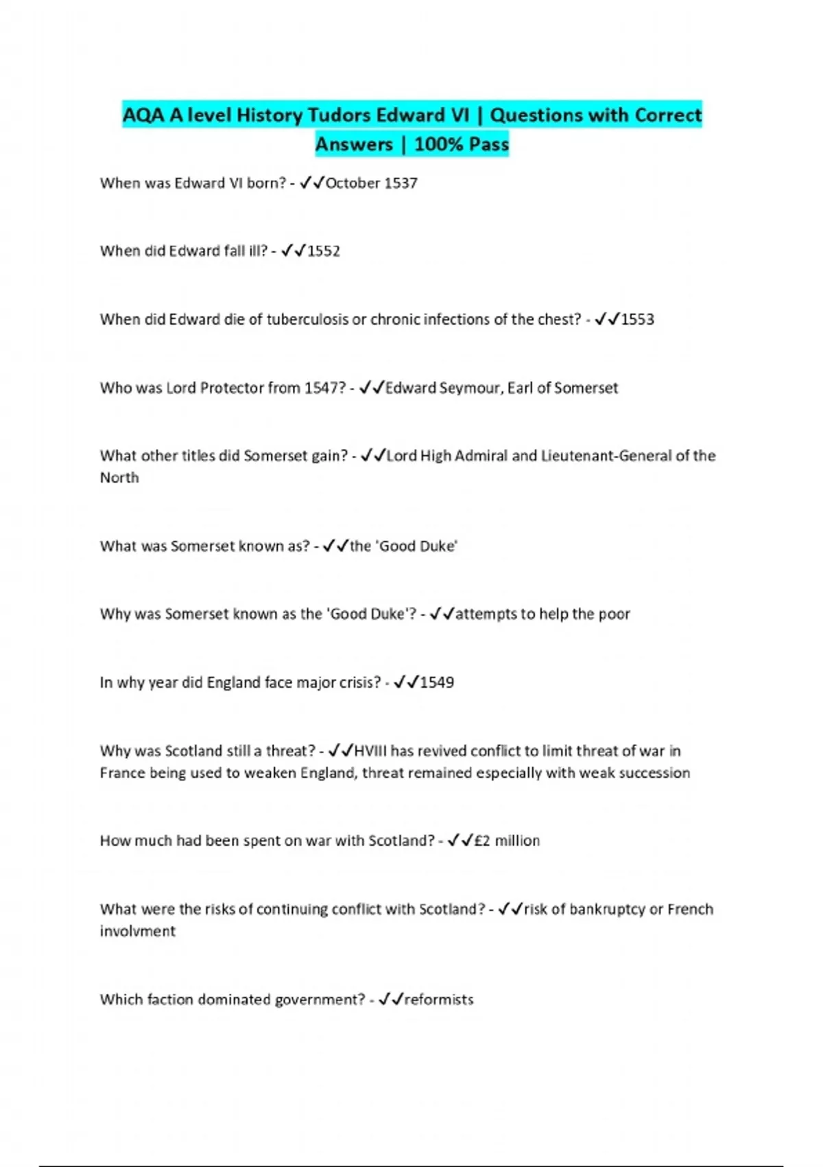 AQA A level History Tudors Edward VI | Questions with Correct Answers | 100% Pass