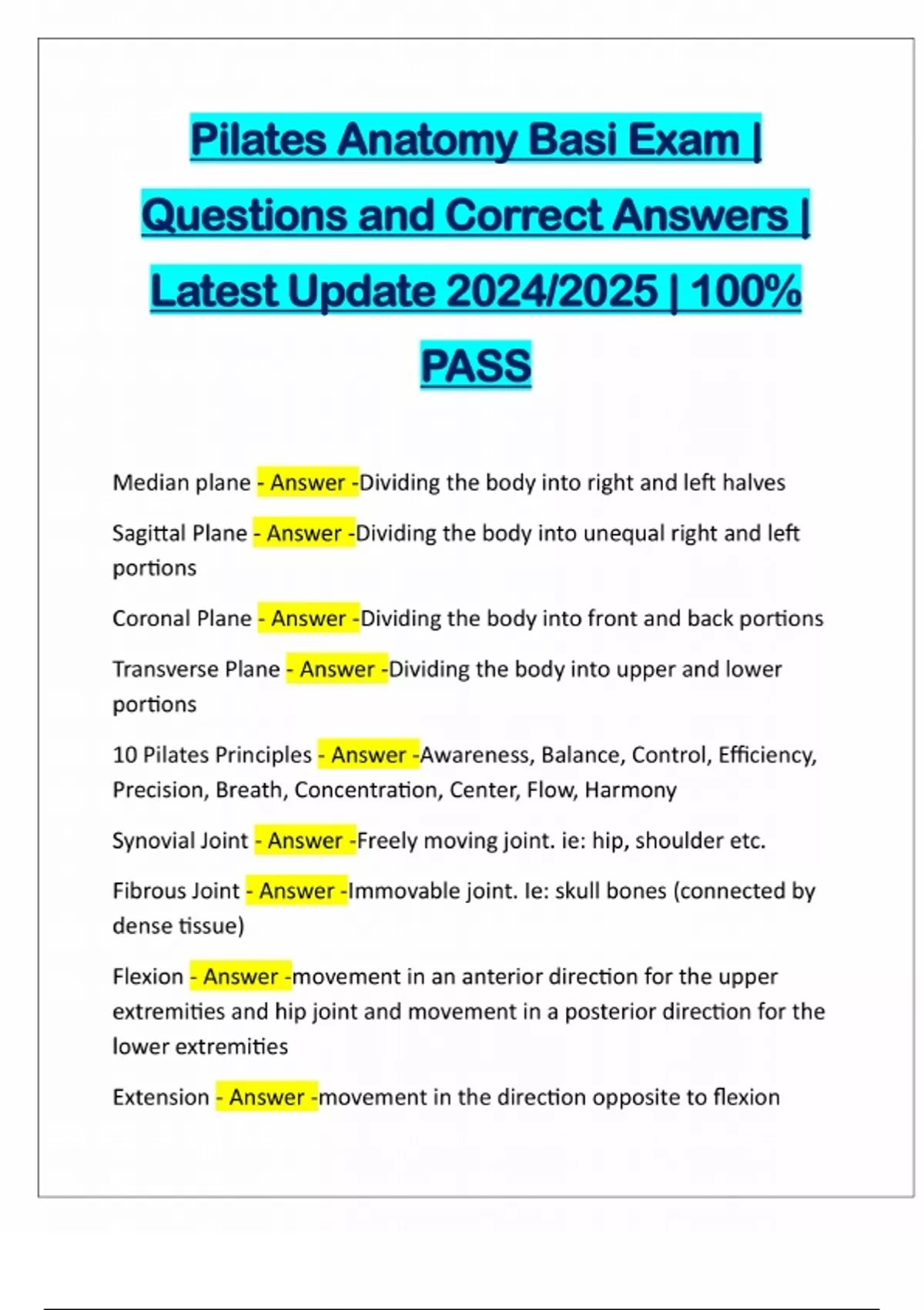 Pilates Anatomy Basi Exam | Questions and Correct Answers | Latest Update 2024/2025 | 100% PASS Median plane - Answer -Dividing the body into right and left halves Sagittal Plane - Answer -Dividing the body into unequal right and left portions Coronal Plane - Answer -Dividing the body into front and back portions Transverse Plane - Answer -Dividing the body into upper and lower portions 10 Pilates Principles - Answer -Awareness, Balance, Control, Efficiency, Precision, Breath, Concentration, Center, Flow, Harmony Synovial Joint - Answer -Freely moving joint. ie: hip, shoulder etc. Fibrous Joint - Answer -Immovable joint. Ie: skull bones (connected by dense tissue) Flexion - Answer -movement in an anterior direction for the upper extremities and hip joint and movement in a posterior direction for the lower extremities Extension - Answer -movement in the direction opposite to flexionHyperextension - Answer -excessive movement/position in the direction of extension e.g. knees, lumbar and cervical curvatures of the spine Abduction - Answer -movement away from the mid-sagittal plane Adduction - Answer -movement towards the mid-sagittal plane Lateral Flexion - Answer -(of the spine) side be