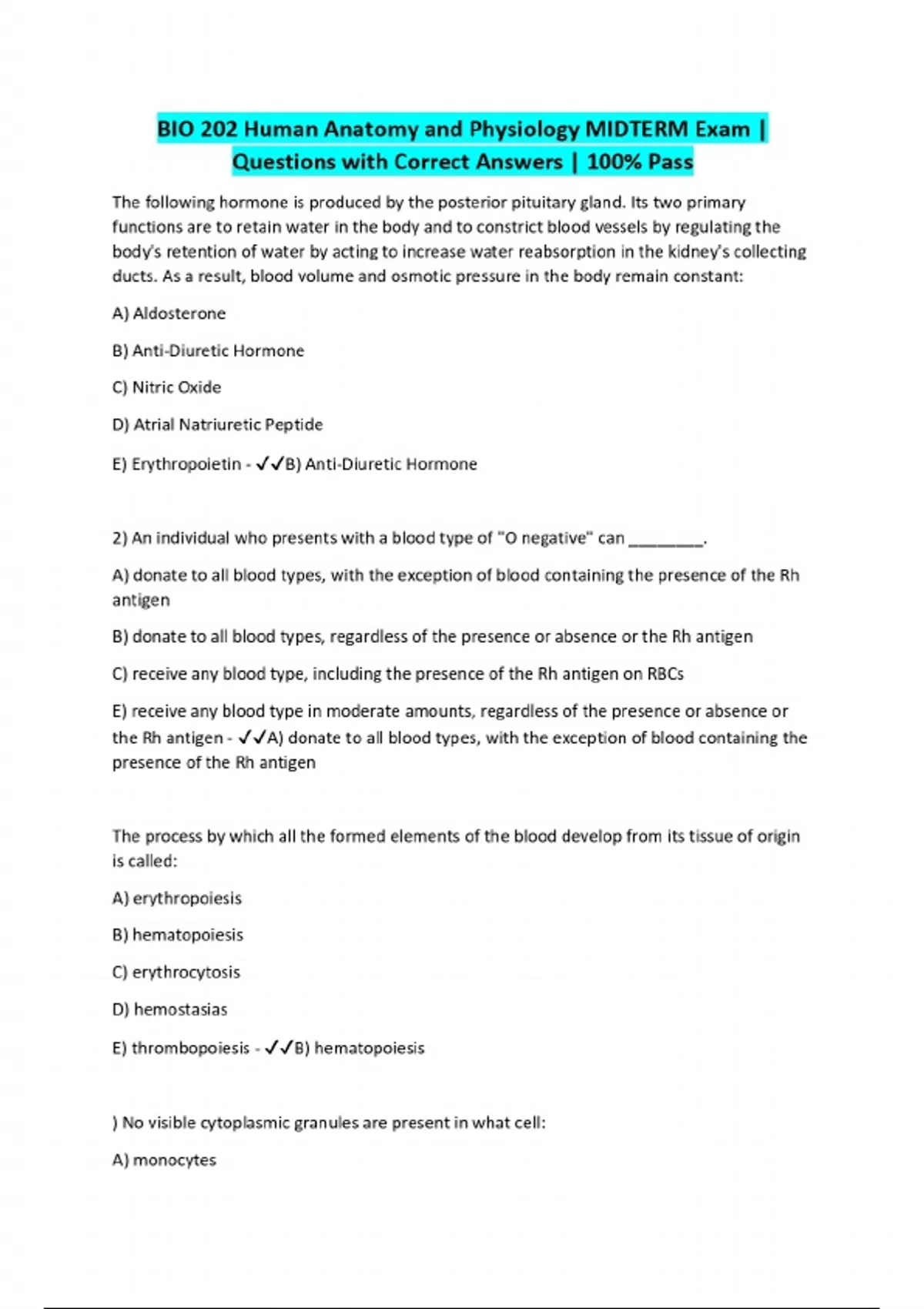 BIO 202 Human Anatomy and Physiology MIDTERM Exam | Questions with Correct Answers | 100% Pass