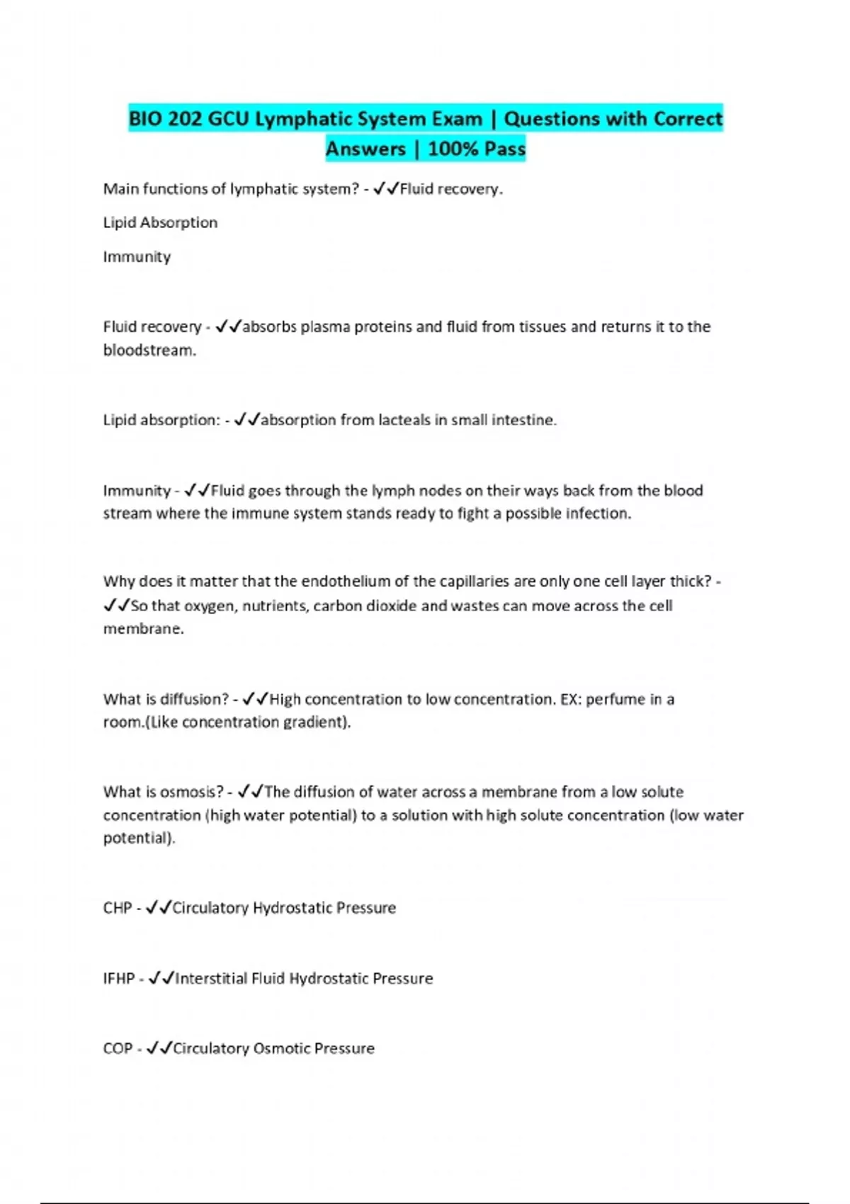 BIO 202 GCU Lymphatic System Exam | Questions with Correct Answers | 100% Pass