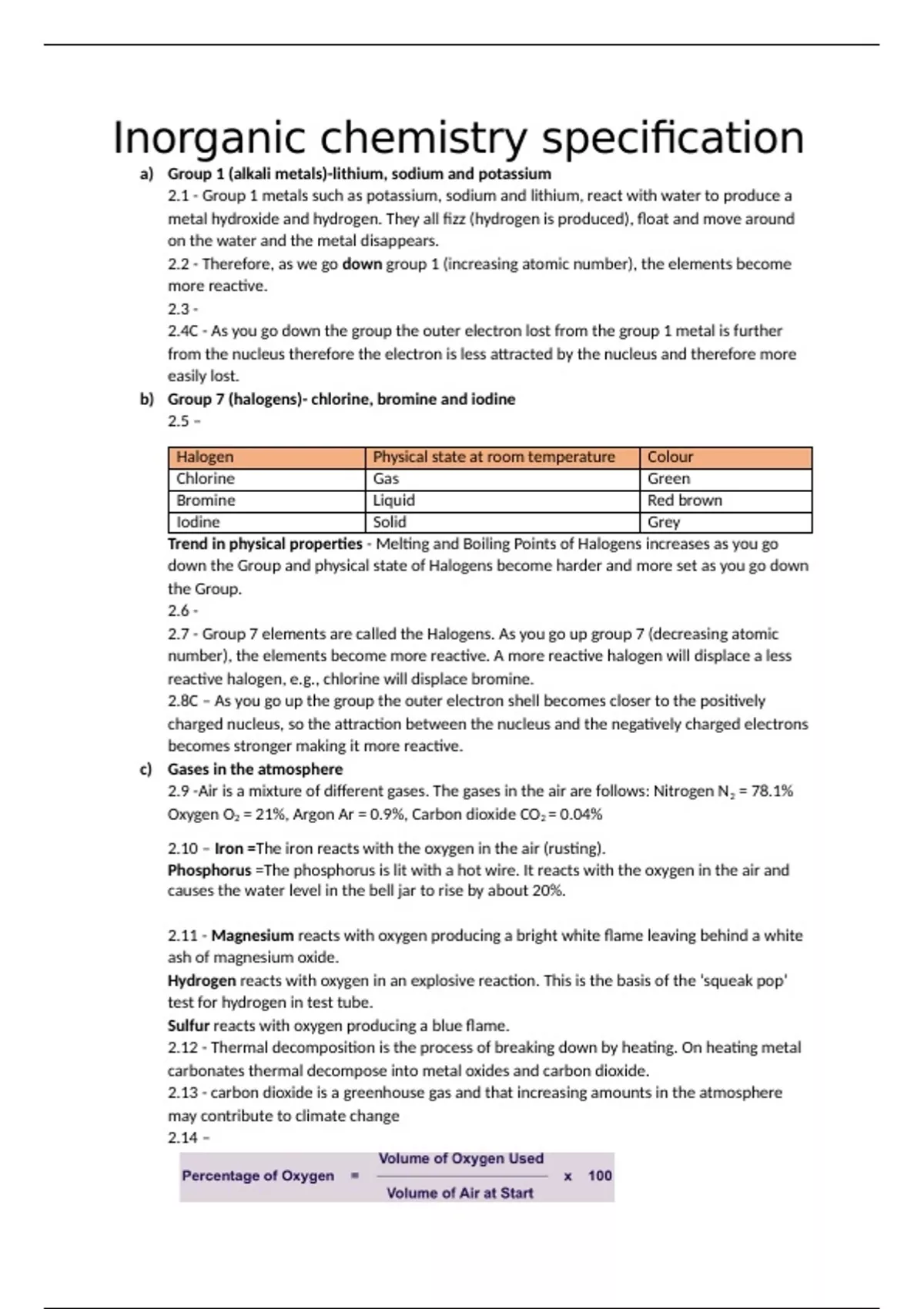 Summary GCSE INORGANIC CHEMISTRY SPECIFICATION NOTES