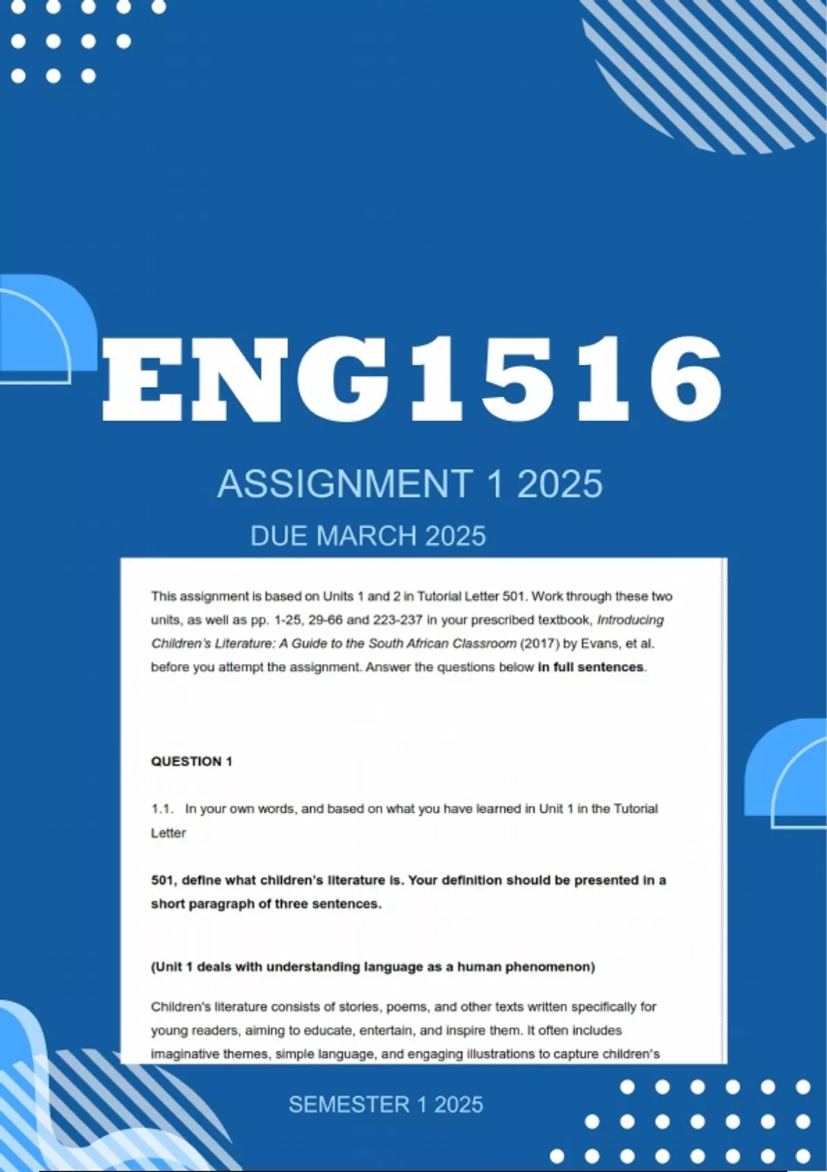 ASSIGNMENT 01: Introducing Children’s Literature This assignment is based on Units 1 and 2 in Tutorial Letter 501. Work through these two units, as well as pp. 1-25, 29-66 and 223-237 in your prescribed textbook, Introducing Children’s Literature: A Guide to the South African Classroom (2017) by Evans, et al. before you attempt the assignment. Answer the questions below in full sentences. QUESTION 1 1.1. In your own words, and based on what you have learned in Unit 1 in the Tutorial Letter 501, define what children’s literature is. Your definition should be presented in a short paragraph of three sentences.