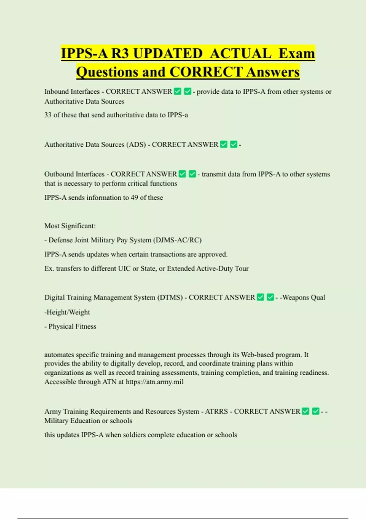 IPPS-A R3 UPDATED ACTUAL Exam Questions and CORRECT Answers Inbound Interfaces - CORRECT ANSWER - provide data to IPPS-A from other systems or Authoritative Data Sources 33 of these that send authoritative data to IPPS-a Authoritative Data Sources (ADS) - CORRECT ANSWER -