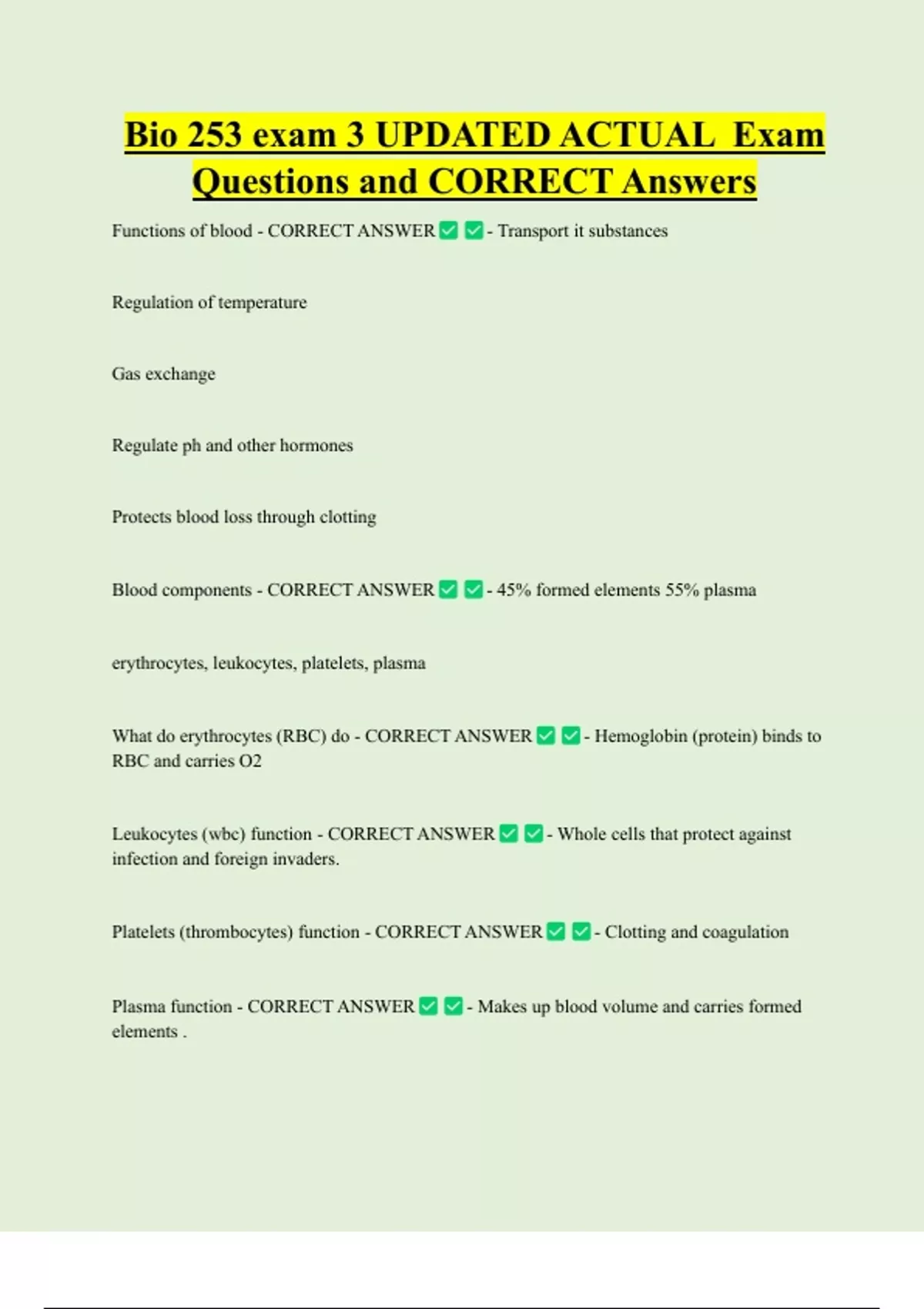 Bio 253 exam 3 UPDATED ACTUAL Exam Questions and CORRECT Answers Functions of blood - CORRECT ANSWER - Transport it substances Regulation of temperature Gas exchange Regulate ph and other hormones Protects blood loss through clotting