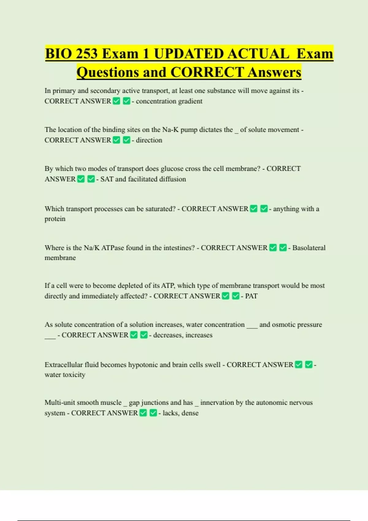 BIO 253 Exam 1 UPDATED ACTUAL Exam Questions and CORRECT Answers In primary and secondary active transport, at least one substance will move against its - CORRECT ANSWER - concentration gradient The location of the binding sites on the Na-K pump dictates the _ of solute movement - CORRECT ANSWER - directio