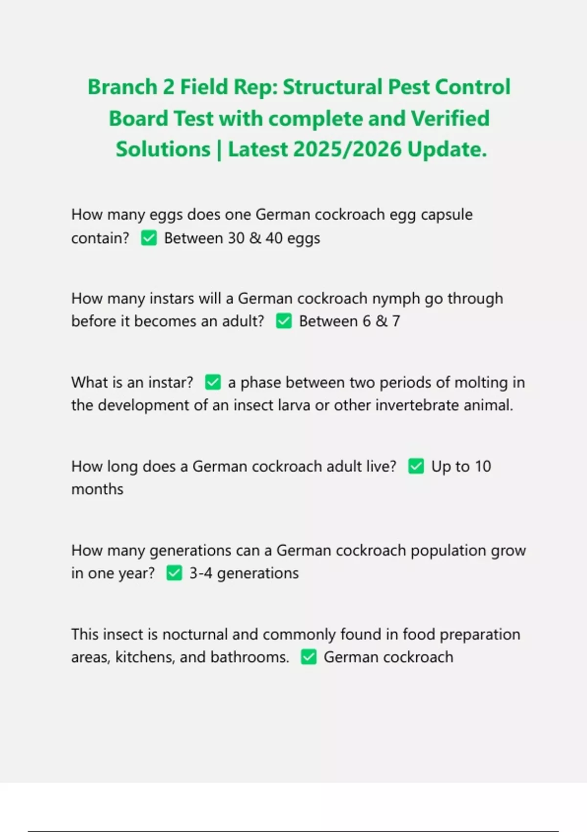 How many eggs does one German cockroach egg capsule contain? Between 30 & 40 eggs How many instars will a German cockroach nymph go through before it becomes an adult? Between 6 & 7 What is an instar? a phase between two periods of molting in the development of an insect larva or other invertebrate animal. How long does a German cockroach adult live? Up to 10 months How many generations can a German cockroach population grow in one year? 3-4 generations This insect is nocturnal and commonly found in food preparation areas, kitchens, and bathrooms. German cockroach Can cockroaches carry disease organisms? Yes! On the loins and bristles of their body as well as on the sticky pads of their feet. They will also defecate on food spreading disease. Examples include dysentery, staphylococcus, streptococcus, and ecoli bacterias. What is the smallest of the domestic cockroaches? The Brown Banded Roach How many eggs does one Brown Banded cockroach egg capsule contain? About 18 eggs. How many days does it take a brown banded cockroach egg to hatch? 50-90 days How many instars will a brown banded cockroach nymph go through before it becomes an adult? 6-8 instars What is the minimum amount of nymphal stages in a bed bug's life cycle prior to adulthood? 5 nymphal stages in a life cycle. Branch 2 Field Rep: Structural Pest Control Board Test with complete and Verified Solutions | Latest 2025/2026 Update.