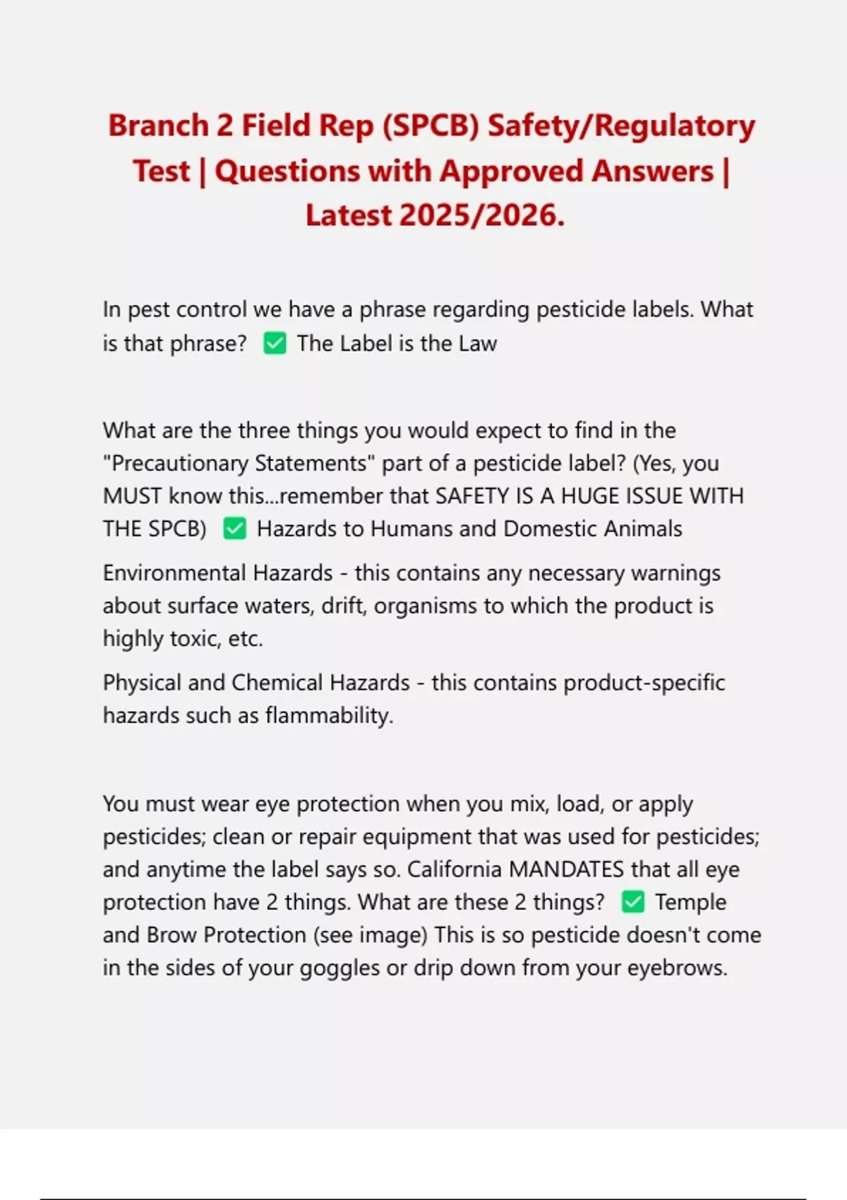 Branch 2 Field Rep (SPCB) Safety/Regulatory Test | Questions with Approved Answers | Latest 2025/2026.