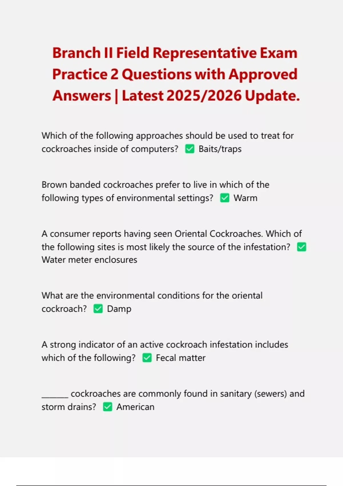 Which of the following approaches should be used to treat for cockroaches inside of computers? Baits/traps Brown banded cockroaches prefer to live in which of the following types of environmental settings? Warm A consumer reports having seen Oriental Cockroaches. Which of the following sites is most likely the source of the infestation? Water meter enclosures What are the environmental conditions for the oriental cockroach? Damp A strong indicator of an active cockroach infestation includes which of the following? Fecal matter _______ cockroaches are commonly found in sanitary (sewers) and storm drains? American Branch II Field Representative Exam Practice 2 Questions with Approved Answers | Latest 2025/2026 Update.