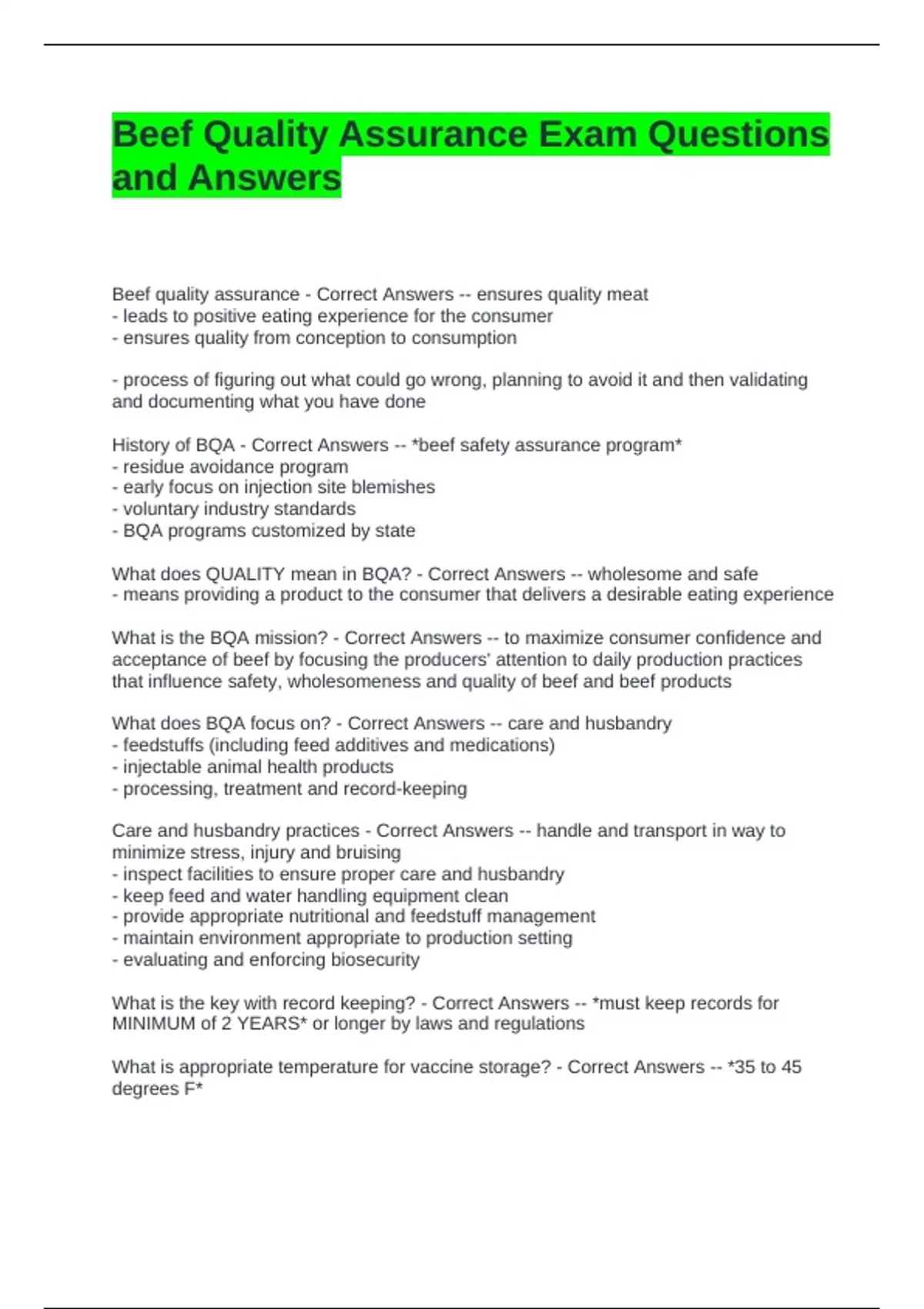 Beef Quality Assurance Exam Questions