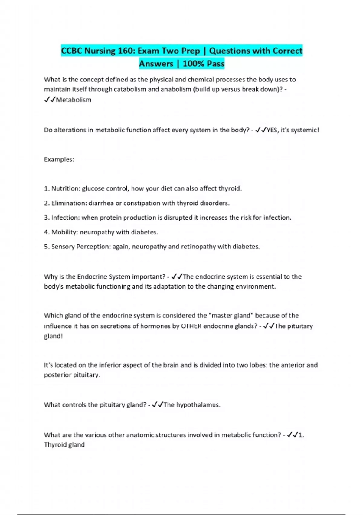 CCBC Nursing 160: Exam Two Prep | Questions with Correct Answers | 100% Pass