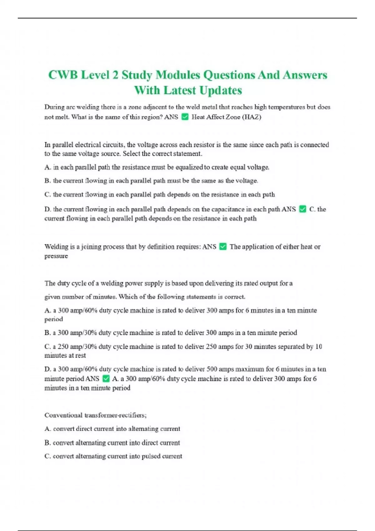 CWB Level 2 Study Modules Questions And Answers With Latest Updates During arc welding there is a zone adjacent to the weld metal that reaches high temperatures but does not melt. What is the name of this region? ANS Heat Affect Zone (HAZ) In parallel electrical circuits, the voltage across each resistor is the same since each path is connected to the same voltage source. Select the correct statement. A. in each parallel path the resistance must be equalized to create equal voltage. B. the current flowing in each parallel path must be the same as the voltage. C. the current flowing in each parallel path depends on the resistance in each path D. the current flowing in each parallel path depends on the capacitance in each path ANS C. the current flowing in each parallel path depends on the resistance in each path Welding is a joining process that by definition requires: ANS The application of either heat or pressure The duty cycle of a welding power supply is based upon delivering its rated output for a given number of minutes. Which of the following statements is correct. A. a 300 amp/60% duty cycle machine is rated to deliver 300 amps for 6 minutes in a ten minute period B. a 300 amp/30% duty cycle machine is rated to deliver 300 amps in a ten minute period C. a 250 amp/30% duty cycle machine is rated to deliver 250 amps for 30 minutes separated by 10 minutes at rest D. a 300 amp/60% duty cycle machine is rated to deliver 500 amps maximum for 6 minutes in a ten minute period ANS A. a 300 amp/60% duty cycle machine is rated to deliver 300 amps for 6 minutes in a ten minute period