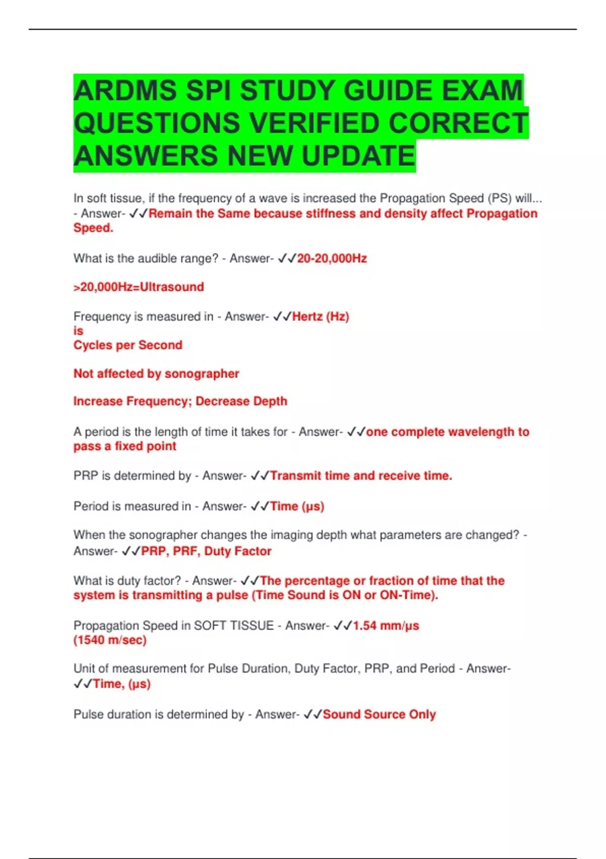 ARDMS SPI STUDY GUIDE ARDMS SPI STUDY GUIDE EXAM QUESTIONS VERIFIED CORRECT ANSWERS NEW UPDATE In soft tissue, if the frequency of a wave is increased the Propagation Speed (PS) will... - Answer- Remain the Same because stiffness and density affect Propagation Speed. What is the audible range? - Answer- 20-20,000Hz >20,000Hz=Ultrasound Frequency is measured in - Answer- Hertz (Hz) is Cycles per Second Not affected by sonographer Increase Frequency; Decrease Depth A period is the length of time it takes for - Answer- one complete wavelength to pass a fixed point PRP is determined by - Answer- Transmit time and receive time. Period is measured in - Answer- Time (μs) When the sonographer changes the imaging depth what parameters are changed? - Answer- PRP, PRF, Duty Factor What is duty factor? - Answer- The percentage or fraction of time that the system is transmitting a pulse (Time Sound is ON or ON-Time). Propagation Speed in SOFT TISSUE - Answer- 1.54 mm/μs (1540 m/sec) Unit of measurement for Pulse Duration, Duty Factor, PRP, and Period - Answer- Time, (μs) Pulse duration is determined by - Answer- Sound Source Only Pulse Duration is controlled by - Answer- the ultrasound system and transducer Pulse Duration Formula - Answer- pulse duration (μs) = # cycles in pulse/frequency(MHz) PD= Number of cycles in Pulse/ Frequency(Hz) Spatial Pulse Length (SPL) (measurement) - Answer- The distance that a pulse occupies in space from the start to the end of a pulse. (mm) Typical values for spatial pulse length in soft tissue. - Answer- 0.1 to 1.0 mm Spatial pulse length is determined by - Answer- sound source and medium Spatial Pulse Length is directly proportional to - Answer- the Number of Cycles in the Pulse and the Wavelength (Directly Proportional means that increased SPL will increase both the number of cycles in the pulse and the wavelength if increased). Spatial pulse length is inversely proportional to - Answer- Frequency (MHz) (Inversely Proportional means that increased SPL will lower frequency. This is because axial resolution is better with lower frequency) Pulse Duration (PD) - Answer- The actual time from the start of a pulse to the end of that pulse; a single transmit, talking, or "on" time. Time the pulse is on typically measured in (ms). Pulse Length - Answer- The distance of the pulse start to end or the duration or length of a single pulse Pulse Length is typically measured in (mm). the ability of an object to resist compression and relates to the hardness of a medium? - Answer- Stiffness. Think: ↑ Stiffness ↑ Speed ↓ Density ↑ Speed An increase in pulse repetition frequency would lead to: - Answer- Increasing pulse repetition frequency, increases duty factor. ↑ PRF ↑ Duty Factor Which of the following would have the highest propagation speed? - Answer- Bone has the highest propagation speed, at m/s. What has the lowest propagation speed? - Answer- air technically has the lowest propagation speed at 300 m/s Which has the Slowest Propagation Speed? Water Soft Tissue Bone Lung tissue - Answer- Lung Tissue As imaging depth increases, the pulse repetition frequency (PRF) must: - Answer- Decrease As imaging depth increase, pulse repeition freqency (PRF) decreases. ↑ Imaging Depth ↓ PRF What describes the amount of refraction that occurs at an interface? - Answer- Snell's law Refraction: the redirection of the transmitted sound beam Snell's law describes the angle of transmission at an interface based on the angle of incidence and the propagation speeds of the two media. Pressure is typically expressed in: - Answer- Pascals (Pa) The typical range of frequency for diagnostic ultrasound imaging is - Answer- 1-20 Mhz is the typical range of frequency for diagnostic ultrasound imaging. The attentuation coefficient in soft tissue is equal to: - Answer- Attentuation Coeffcient = 1/2 (one half of the frequency in soft tissue) The attentuation coeffcient (in dB/cm) is the rate at which sound is attentuated per unit depth. Micro is denoted as: - Answer- Micro is denoted as millionth (µ)