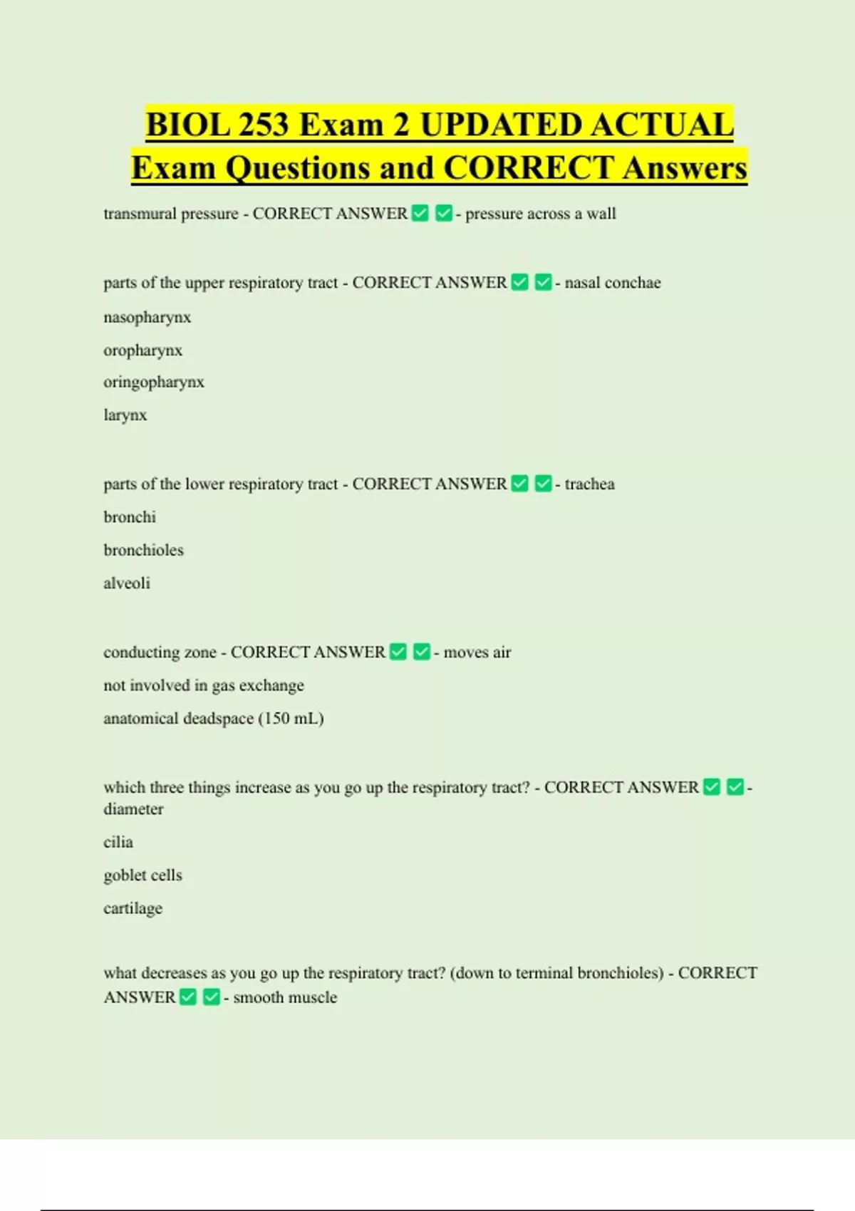 BIOL 253 Exam 2 UPDATED ACTUAL Exam Questions and CORRECT Answers transmural pressure - CORRECT ANSWER - pressure across a wall parts of the upper respiratory tract - CORRECT ANSWER - nasal conchae nasopharynx oropharynx oringopharynx larynx