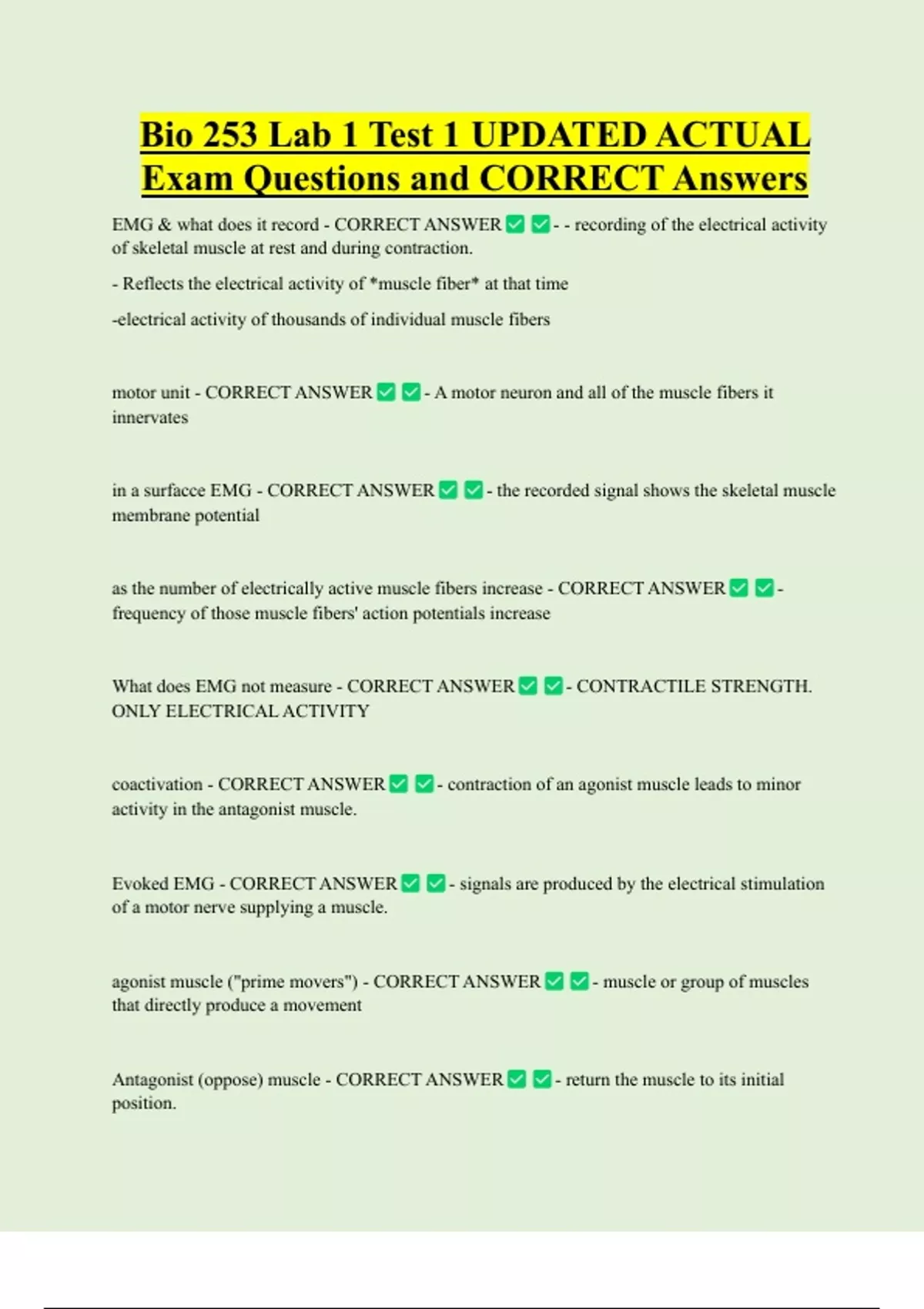 Bio 253 Lab 1 Test 1 UPDATED ACTUAL Exam Questions and CORRECT Answers EMG & what does it record - CORRECT ANSWER - - recording of the electrical activity of skeletal muscle at rest and during contraction. - Reflects the electrical activity of *muscle fiber* at that time -electrical activity of thousands of individual muscle fibers motor unit - CORRECT ANSWER - A motor neuron and all of the muscle fibers it innervat