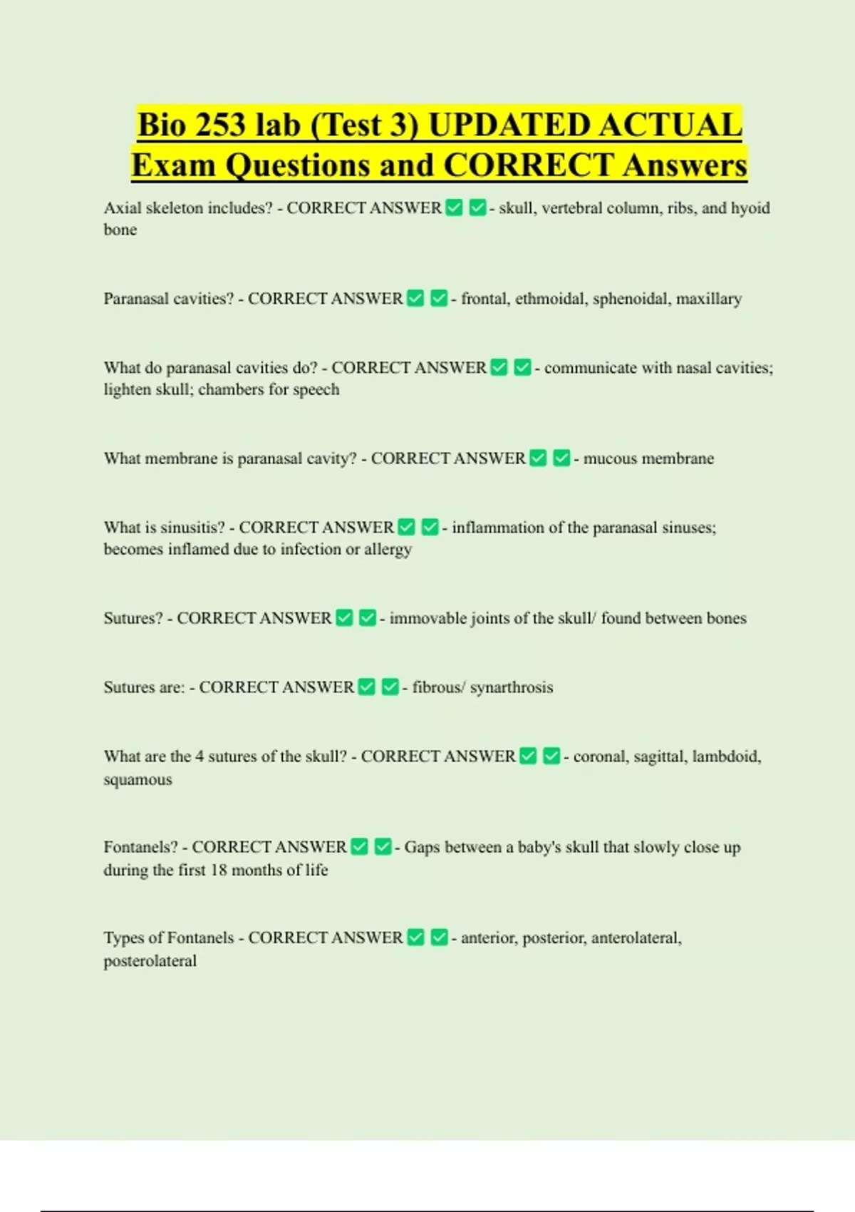 Bio 253 lab (Test 3) UPDATED ACTUAL Exam Questions and CORRECT Answers Axial skeleton includes? - CORRECT ANSWER - skull, vertebral column, ribs, and hyoid bone Paranasal cavities? - CORRECT ANSWER - frontal, ethmoidal, sphenoidal, maxillary What do paranasal cavities do? - CORRECT ANSWER - communicate with nasal cavities; lighten skull; chambers for speech