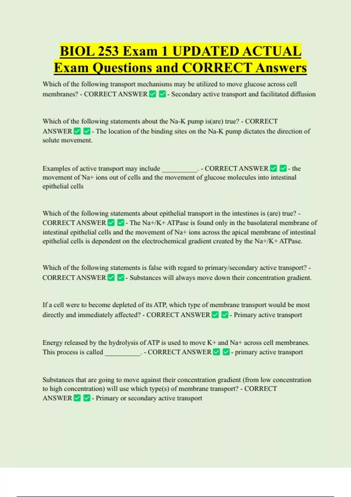 BIOL 253 Exam 1 UPDATED ACTUAL Exam Questions and CORRECT Answers Which of the following transport mechanisms may be utilized to move glucose across cell membranes? - CORRECT ANSWER - Secondary active transport and facilitated diffusion Which of the following statements about the Na-K pump is(are) true? - CORRECT ANSWER - The location of the binding sites on the Na-K pump dictates the direction of solute movemen