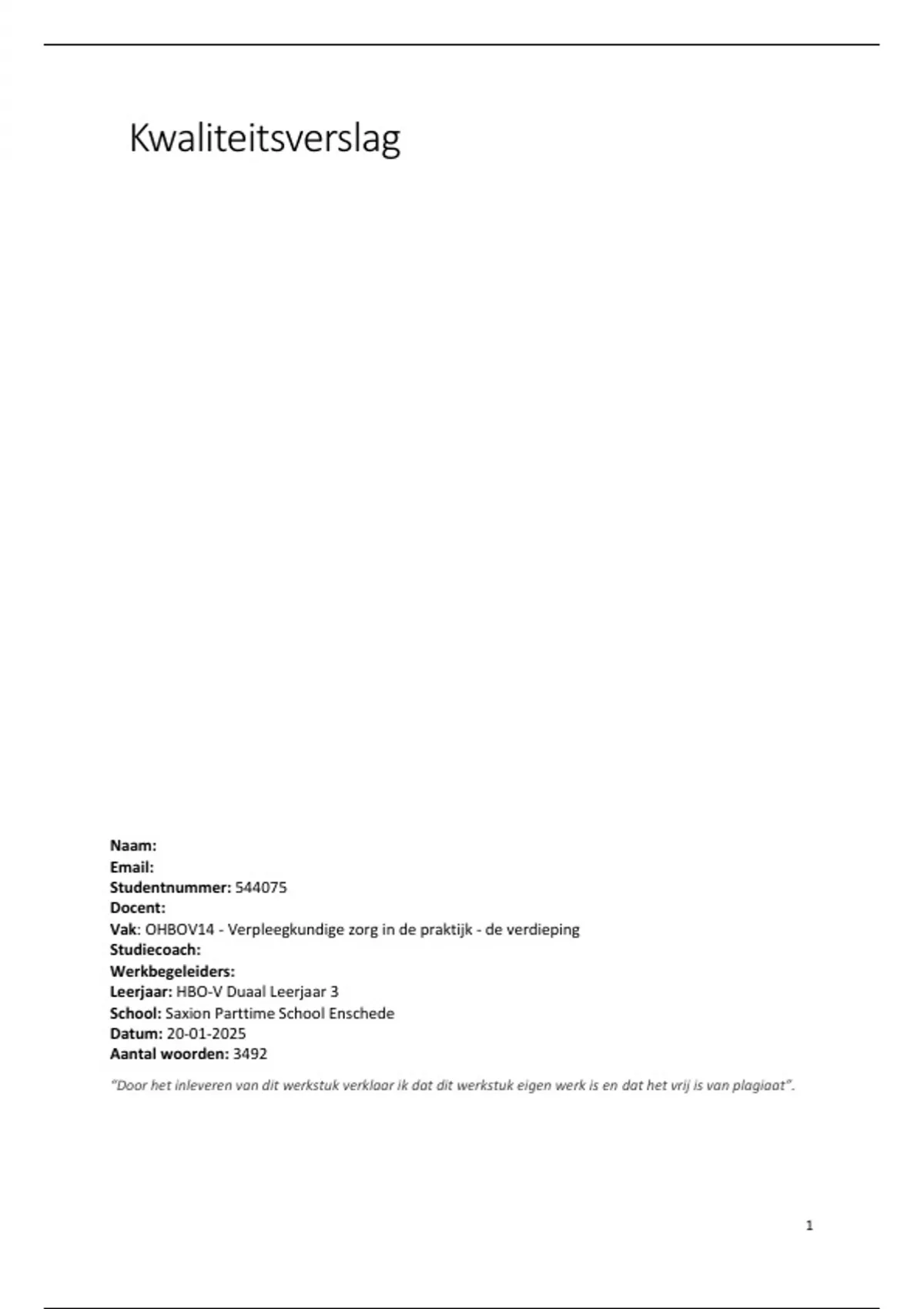 “Door het inleveren van dit werkstuk verklaar ik dat dit werkstuk eigen werk is en dat het vrij is van plagiaat”.