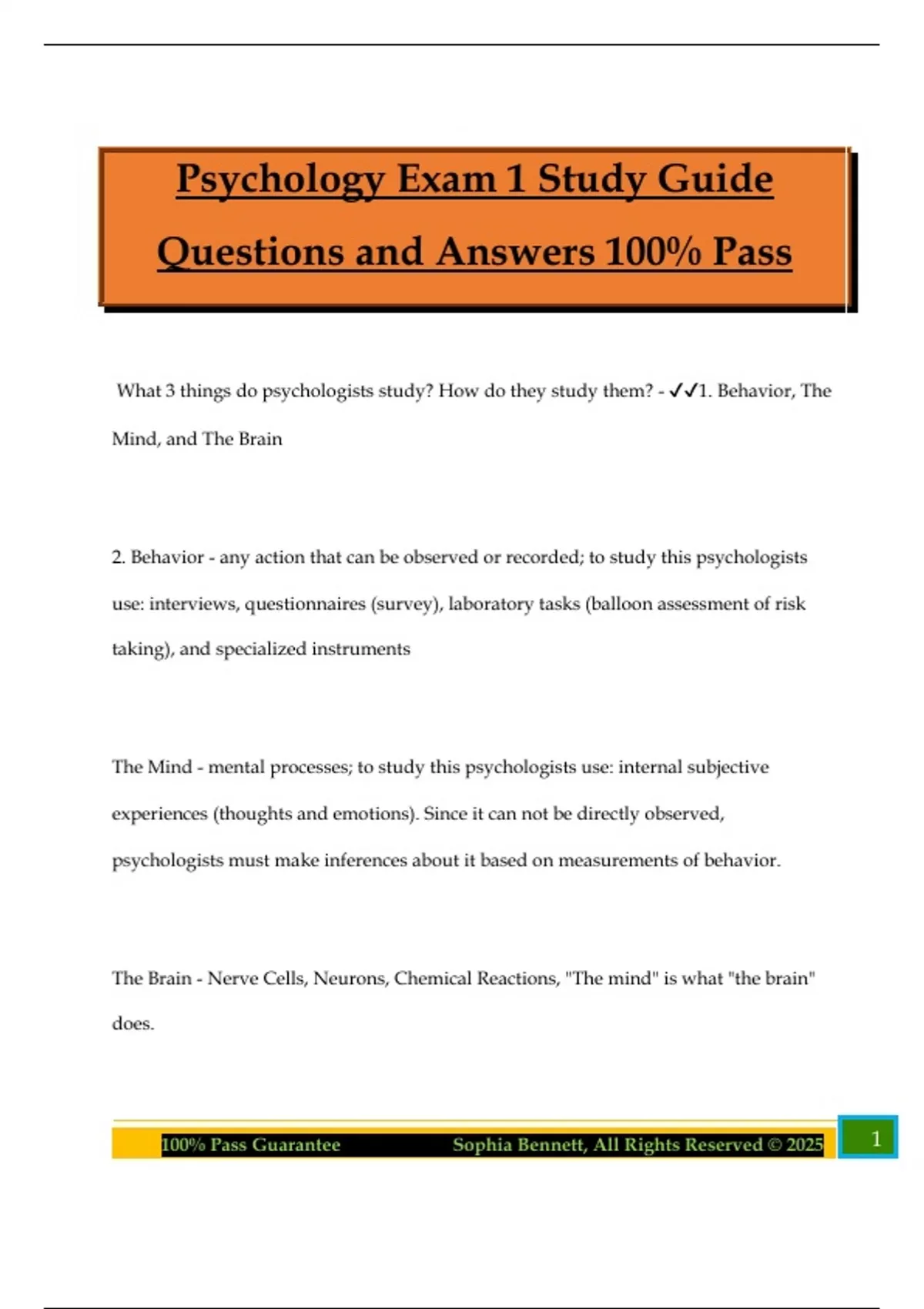 Psychology Exam 1 Study Guide Questions and Answers 100% Pass What 3 things do psychologists study? How do they study them? - 1. Behavior, The Mind, and The Brain 2. Behavior - any action that can be observed or recorded; to study this psychologists use: interviews, questionnaires (survey), laboratory tasks (balloon assessment of risk taking), and specialized instruments The Mind - mental processes; to study this psychologists use: internal subjective experiences (thoughts and emotions). Since it can not be directly observed, psychologists must make inferences about it based on measurements of behavior. The Brain - Nerve Cells, Neurons, Chemical Reactions, "The mind" is what "the brain" does. 2100% Pass Guarantee Sophia Bennett, All Rights Reserved © 2025 What makes a psychology a science? What do we mean when we say that Psychology is an "Empirical Science"? - 1. What makes any field a science? Not what is studied (subject matter) but about how knowledge is obtained. 2. Empirical Science - based on evidence; psychology os called this because everything else is likely to be unreliable ("self help" books, palm readings) Who were and what was the aim of the Structuralists? - The Structuralists tried to describe a Psychological experience. (Fear elicits arousal, behavior, and cognitions) 1. Wilhelm Wundt - founded world's first psychology lab, pioneered introspection (looking inward to report on the experience of thought. 2. Edward Titchener (student of Wundt) - true father of structuralism, believed that experience could be broken down into constituent parts. Who were and what was the aim of the Functionalists? - Functionalism focused on the function of the mind rather than the form of it (structuralist). (e.g. What is the function of fear?) 1. William James - founded first psychology lab in America 3100% Pass Guarantee Sophia Bennett, All Rights Reserved © 2025 Who were and what was the aim of the Gestalt Psychologists? - Gestalt Psychologists (Wertheimer and Kohler) believed that the whole is greater than the sum of it's parts. It focuses on perceptual experiences and the average person's experiences. Perception of objects is subjective and dependent on context. Why did the psychoanalysts (e.g., Freud) and behaviorists clash? What can we take from both of these groups with regard to the modern day study of psychology? - What is the "Biopsychosocial" approach and how do we use it in modern day psychology? - Different levels of analysis can be used to understand any psychological process. Examples: Why did John punch his sister? 1. Biological Level - (Hormonal/Neurological, Testosterone? Amygdala?); Evolutionary - is there something about our evolutionary past that would make males more aggressive than females. 2. Psychological Level - Cognitive (hostile cognitive biases), Personality (Type A Personality? Trait Aggressiveness) 3. Social Cultural Level - Cultural Differences (culture of honor), Recent exposure to violent media? 4100% Pass Guarantee Sophia Bennett, All Rights Reserved © 2025 What are the limitations on human intuition? How do they influence our thinking? - 1. Confirmation bias - tendency to seek out information that confirms our beliefs while ignoring or discounting evidence that confirms it 2. Overconfidence - tendency to believe that we know more than we actually do (we are generally more confident in our beliefs and abilities than we really should be). Overconfidence is the worst for people who know the least. -Kahneman and Tversky: air distance between New Dehli and Beiking, 30% of people made incorrect esitmates -Kruger and Dunning: "unskilled but unaware", those who do the poorest at grammar, logic, humor are the most confident in their high abilities. 3. Hindsight Bias - tendency to judge past knowledge based on current knowledge -Murphy: people's behavior is pretty much what you would expe