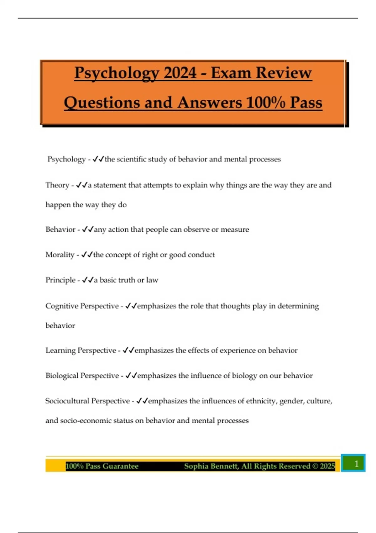Psychology 2024 - Exam Review Questions and Answers 100% Pass Psychology - the scientific study of behavior and mental processes Theory - a statement that attempts to explain why things are the way they are and happen the way they do Behavior - any action that people can observe or measure Morality - the concept of right or good conduct Principle - a basic truth or law Cognitive Perspective - emphasizes the role that thoughts play in determining behavior Learning Perspective - emphasizes the effects of experience on behavior Biological Perspective - emphasizes the influence of biology on our behavior Sociocultural Perspective - emphasizes the influences of ethnicity, gender, culture, and socio-economic status on behavior and mental processes