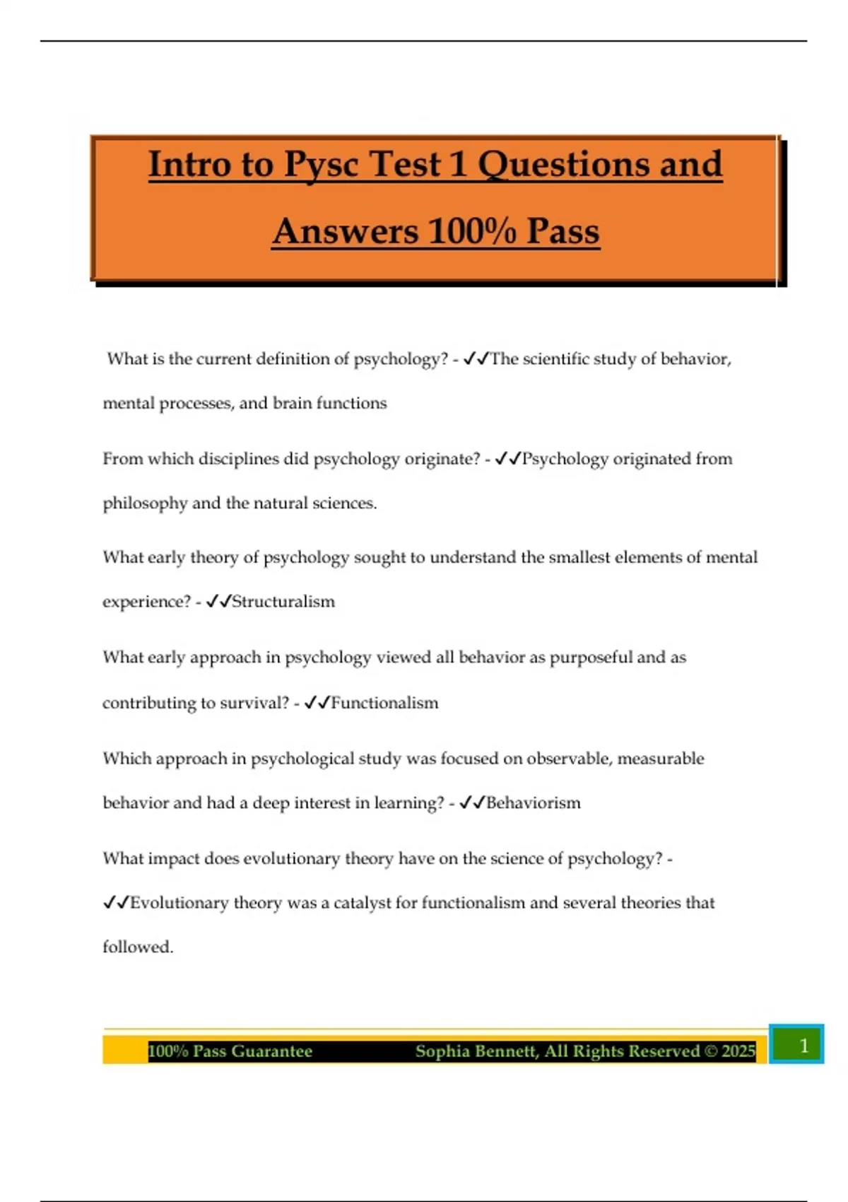 Intro to Pysc Test 1 Questions and Answers 100% Pass What is the current definition of psychology? - The scientific study of behavior, mental processes, and brain functions From which disciplines did psychology originate? - Psychology originated from philosophy and the natural sciences. What early theory of psychology sought to understand the smallest elements of mental experience? - Structuralism What early approach in psychology viewed all behavior as purposeful and as contributing to survival? - Functionalism Which approach in psychological study was focused on observable, measurable behavior and had a deep interest in learning? - Behaviorism What impact does evolutionary theory have on the science of psychology? - Evolutionary theory was a catalyst for functionalism and several theories that followed. 2100% Pass Guarantee Sophia Bennett, All Rights Reserved © 2025 What early approach in psychology encouraged the consideration of the whole perceptive experience? - Gestalt psychology Who is regarded as the first psychologist and is often referred to as the father of psychology? - Wilhelm Wundt Which psychological perspective focuses on the relationship between mind and behavior, as well as their underlying processes? - Biological psychology Which option provides the best description of the cognitive approach to psychology? - The approach that studies how we think, or process information, remember, and decide Dr. McLean believes that behavior exists in its present form because it provided some advantage to our ancestors. What perspective is Dr. McLean using? - Evolutionary psychology What do social psychologists study? - The effects of the social environment, including social and cultural diversity What type of psychologist provides academic and career counseling as part of their career? - School psychologist Mary is interested in understanding an individual's characteristic way of thinking, feeling, and behaving. What topic should she choose to study? - Personality