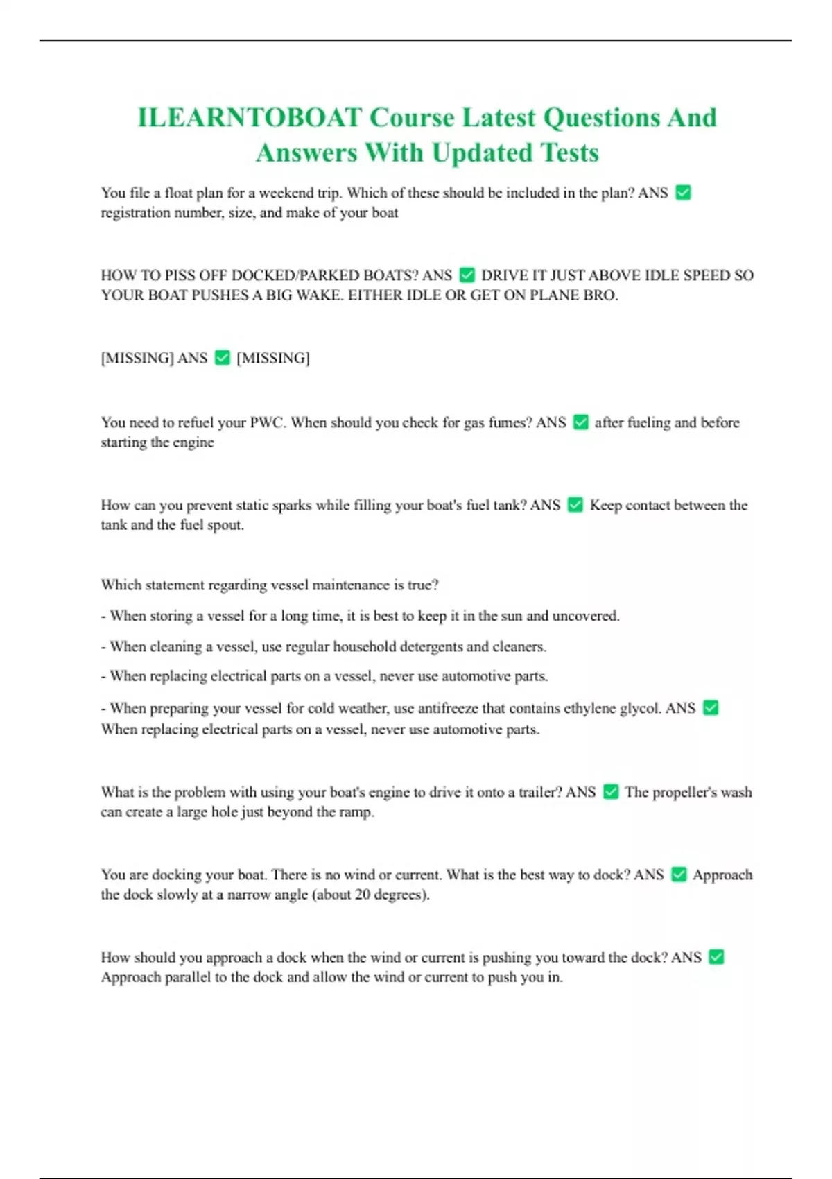 ILEARNTOBOAT Course Latest Questions And Answers With Updated Tests You file a float plan for a weekend trip. Which of these should be included in the plan? ANS registration number, size, and make of your boat HOW TO PISS OFF DOCKED/PARKED BOATS? ANS DRIVE IT JUST ABOVE IDLE SPEED SO YOUR BOAT PUSHES A BIG WAKE. EITHER IDLE OR GET ON PLANE BRO. [MISSING] ANS [MISSING] You need to refuel your PWC. When should you check for gas fumes? ANS after fueling and before starting the engine How can you prevent static sparks while filling your boat's fuel tank? ANS Keep contact between the tank and the fuel spout. Which statement regarding vessel maintenance is true? - When storing a vessel for a long time, it is best to keep it in the sun and uncovered. - When cleaning a vessel, use regular household detergents and cleaners. - When replacing electrical parts on a vessel, never use automotive parts. - When preparing your vessel for cold weather, use antifreeze that contains ethylene glycol. ANS When replacing electrical parts on a vessel, never use automotive parts.