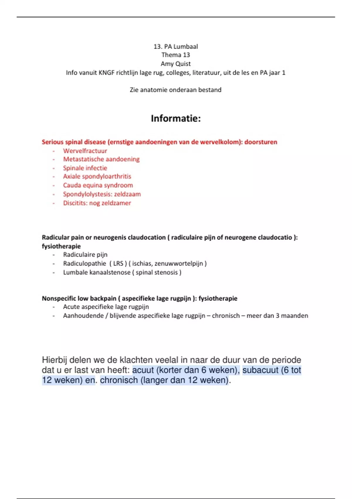 Info vanuit KNGF richtlijn lage rug, colleges, literatuur, uit de les en PA jaar 1