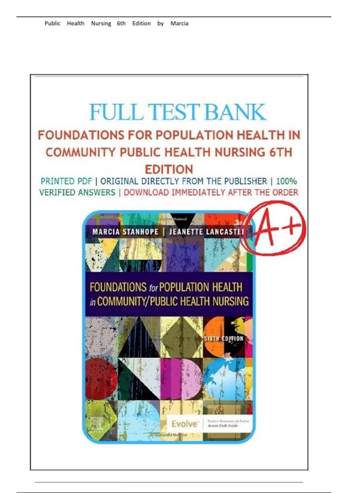 ******** INSTANT DOWNLOAD AS PDF FILE ******** INSTANT ACCESS: Download the complete Test Bank for *Foundations for Population Health in Community/Public Health Nursing, 6th Edition* by Marcia Stanhope & Jeanette Lancaster immediately after purchase! This 100% verified test bank contains ALL CHAPTERS 1–32 with accurate answers to help you ace your exams and master course content. Perfect for nursing students, instructors, and anyone studying community/public health nursing. WHAT’S INCLUDED: All Chapters 1–32 – Full coverage of the entire textbook Multiple Choice & Multiple Response Questions – With detailed rationales Verified Answers – Direct from the publisher, 100% accurate Instant Digital Download – Get it now, study anytime Printable PDF Format – Easy to use on any device CHAPTERS COVERED: Public Health Foundations & Population Health History of Public Health Nursing US & Global Health Care Government, Law, & Policy Economics of Health Care Ethics in Nursing Cultural Competence Environmental Health Evidence-Based Practice Epidemiology ... and all remaining chapters through 32. PERFECT FOR: Nursing students preparing for exams Instructors creating quizzes and tests Review for NCLEX & certification exams Quick reference and study reinforcement ️ NOTE: This is a TEST BANK – not the textbook. It is designed to help you test your knowledge and prepare effectively. Get the edge you need—download now and start studying with confidence!