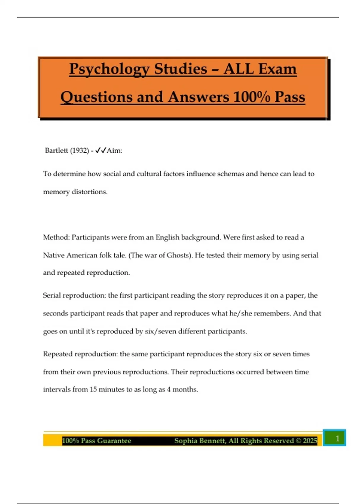 Psychology Studies – ALL Exam Questions and Answers 100% Pass Bartlett (1932) - Aim: To determine how social and cultural factors influence schemas and hence can lead to memory distortions. Method: Participants were from an English background. Were first asked to read a Native American folk tale. (The war of Ghosts). He tested their memory by using serial and repeated reproduction. Serial reproduction: the first participant reading the story reproduces it on a paper, the seconds participant reads that paper and reproduces what he/she remembers. And that goes on until it's reproduced by six/seven different participants. Repeated reproduction: the same participant reproduces the story six or seven times from their own previous reproductions. Their reproductions occurred between time intervals from 15 minutes to as long as 4 months. 2100% Pass Guarantee Sophia Bennett, All Rights Reserved © 2025 Results: Both methods lead to similar results. As the number of reproductions increased, the story became shorter and there were more changes to the story. The changes made by the participants in thie reproduction show the alteration of culturally unfamiliar things into what the English participants were culturally familiar with. He found that recalled stories were distorted and altered in various ways making it more conventional and cultural perspective (rationalization). Conclusion: Memory is inaccurate and is always subject to reconstruction based on pre-existing schemas. Brown and Kulik (1977) - Aim: To investigate correlations between cultures and flashbulb memories To determine the conditions in which flashbulb memories are created. Method: Participants: 40 African-Americans 40 Caucasian Americans 3100% Pass Guarantee Sophia Bennett, All Rights Reserved © 2025 Year 20-60 Questionnaires about 10 very unexpected or novel events 9 of them public, 1 personal Also filled in if they talked about the event with someone (overt rehearsal) Results: African Americans: John f Kennedy:40 Malcolm x:14 Gerald Ford:16 Martin Luther King:30 Caucasian Americans: John F. Kennedy: 39 Malcolm X:1 Gerald Ford: 23 Martin Luther King:13 4100% Pass Guarantee Sophia Bennett, All Rights Reserved © 2025 Remembered vivid memories from the different events Jfk was the memory that most remembered (79/80) JFK was also rehearsed the most. African Americans had more flashbulb memories than Caucasian Americans The personal FMB was most often a death of someone close. Most often remembered things: Place, ongoing activity, information, own affect, other affect and aftermath Conclusion: FMB forms from surprising and emotional events and are maintained by overt rehaearsal. The difference between FMB and regular memories is FBM being more vivid and longer lasting Suggests that Flahshbulb memories form when related to you. Glanzer and Kunitz (1966) - Aim: To test the hypothesis that there are two distinct storage mechanisms that produce the serial position curve in free recall. 5100% Pass Guarantee Sophia Bennett, All Rights Reserved © 2025 Method: Participants were introduced to 15 words, one at a time (one word at the time). There were two conditions, immediate free recall (IFR) where participants were to repeat the words immediately after, in any order, and the other one were delayed free recall (DFR) where the participants where to wait for 30 seconds and then count backward - this to prevent rehearsing and then recall the word in any order. Results: Participants remembered the first and last few words better and the results were so that the fell into a pattern known as the ''serial position curve'' which means that the tops of performance are in the beginning and end. In the IFR condition there were a true serial postion curve, both the top at the beginning and the end. But in the DFR the last few words were not recalled because of loss through decay. Conclusion: Supports the -multi-store-model in the way memory consists of different storage systems. 6100% Pass Guarantee Sophia Bennett, All Rights Reserved © 2025 Explained the primacy effect (recalling the first words) by claiming it was recalle from the Long term storage (LTS). First words attracted attention and were rehearsed in Short term storage (STS) and then transferred to LTS. Explained the recency effect (recalling the last words) by claiming that it was recalled from the STS. During the DFR the rehearsal was busy with other information and could therefore not rehears the word and store them in LTS.