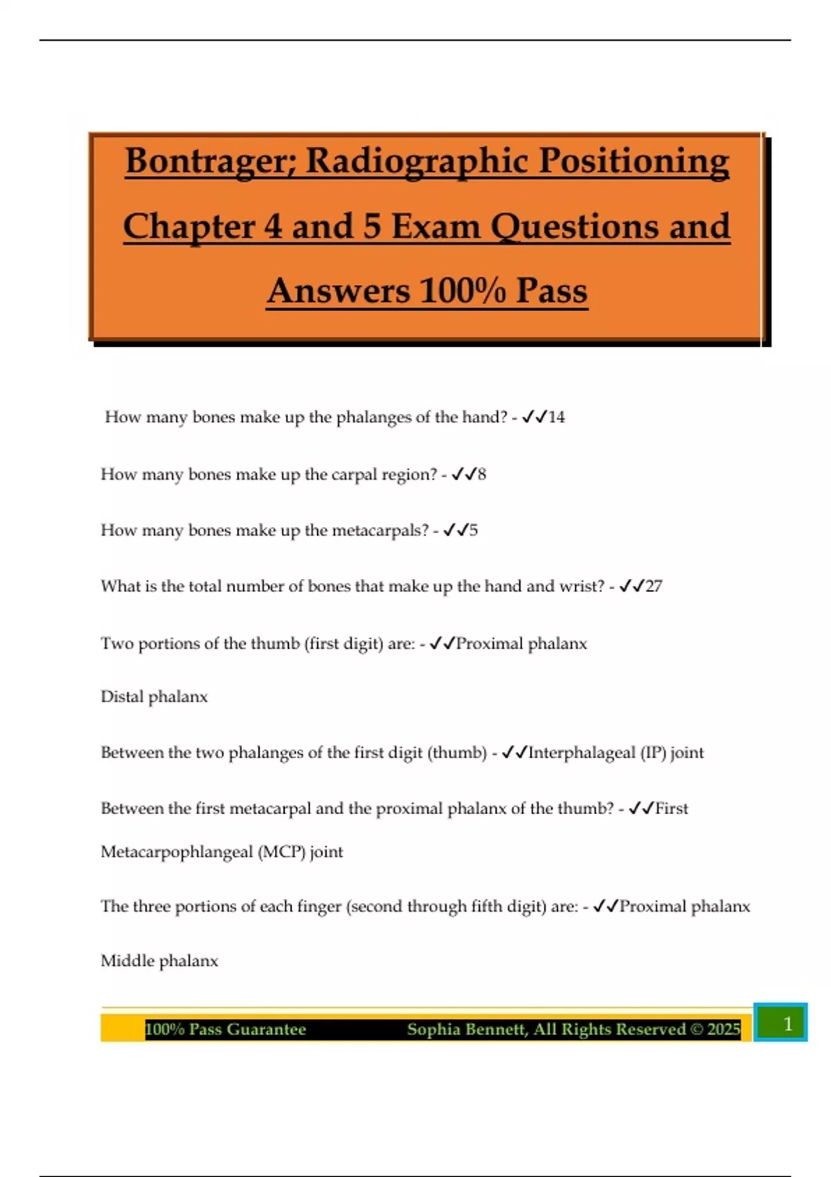 Bontrager; Radiographic Positioning Chapter 4 and 5 Exam Questions and Answers 100% Pass How many bones make up the phalanges of the hand? - 14 How many bones make up the carpal region? - 8 How many bones make up the metacarpals? - 5 What is the total number of bones that make up the hand and wrist? - 27 Two portions of the thumb (first digit) are: - Proximal phalanx Distal phalanx Between the two phalanges of the first digit (thumb) - Interphalageal (IP) joint Between the first metacarpal and the proximal phalanx of the thumb? - First Metacarpophlangeal (MCP) joint The three portions of each finger (second through fifth digit) are: - Proximal phalanx Middle phalanx 2100% Pass Guarantee Sophia Bennett, All Rights Reserved © 2025 Distal phalanx Three parts of each phalanx, distally are: - Head Body (shaft) Base Between the middle and distal phalanges of the fourth digit? - Fourth Distal interphlangeal (DIP) joint Between the carpals and the first metacarpal? - First Carpometacarpal (CMC) joint Between the forearm and the carpals? - Radiocarpal Between the distal radius and ulna? - Distal radioulnar T/F The entire metacarpal and trapezium must be demonstrated on all projections of the thumb - True A _______ bone is frequently found adjacent to the metacarpophalangeal (MCP) joint of the thumb - Sesamoid bone The first metacarpal articulates with what carpal bone? - Trapezuim The second metacarpal articulates with what carpal bone? - Trapezoid The third metacarpal articulates with what carpal bone? - Capitate The fourth and fifth metacarpal articulates with what carpal bone? - Hamate 3100% Pass Guarantee Sophia Bennett, All Rights Reserved © 2025 Which carpal bone contains a "hooklike" process? - Hamate Which carpal bone is most commonly fractured? - Scaphoid Which is the largest of the carpal bones? - Capitate Which two carpal bones are located most anteriorly as seen on a lateral wrist radiograph? - Scaphoid and trapezium Which ligament of the wrist extends from the styloid process of the radius to the lateral aspect of the scaphoid and trapezium bones? - Radial collateral ligam