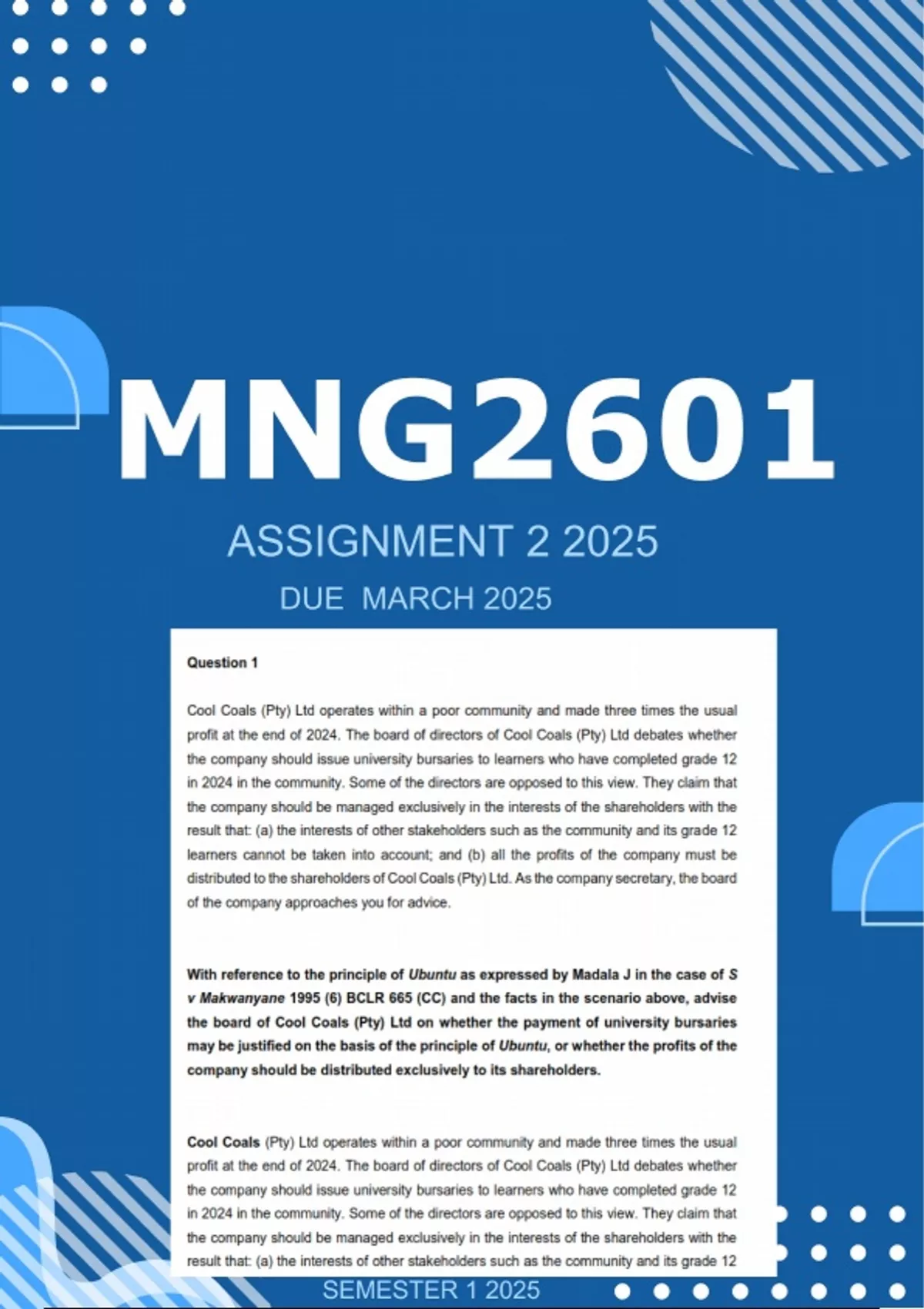 MRL2601 ASSIGNMENT 2 MARCH 2025 Question 1 Cool Coals (Pty) Ltd operates within a poor community and made three times the usual profit at the end of 2024. The board of directors of Cool Coals (Pty) Ltd debates whether the company should issue university bursaries to learners who have completed grade 12 in 2024 in the community. Some of the directors are opposed to this view. They claim that the company should be managed exclusively in the interests of the shareholders with the result that: (a) the interests of other stakeholders such as the community and its grade 12 learners cannot be taken into account; and (b) all the profits of the company must be distributed to the shareholders of Cool Coals (Pty) Ltd. As the company secretary, the board of the company approaches you for advice. With reference to the principle of Ubuntu as expressed by Madala J in the case of S v Makwanyane 1995 (6) BCLR 665 (CC) and the facts in the scenario above, advise the board of Cool Coals (Pty) Ltd on whether the payment of university bursaries may be justified on the basis of the principle of Ubuntu, or whether the profits of the company should be distributed exclusively to its shareholders.