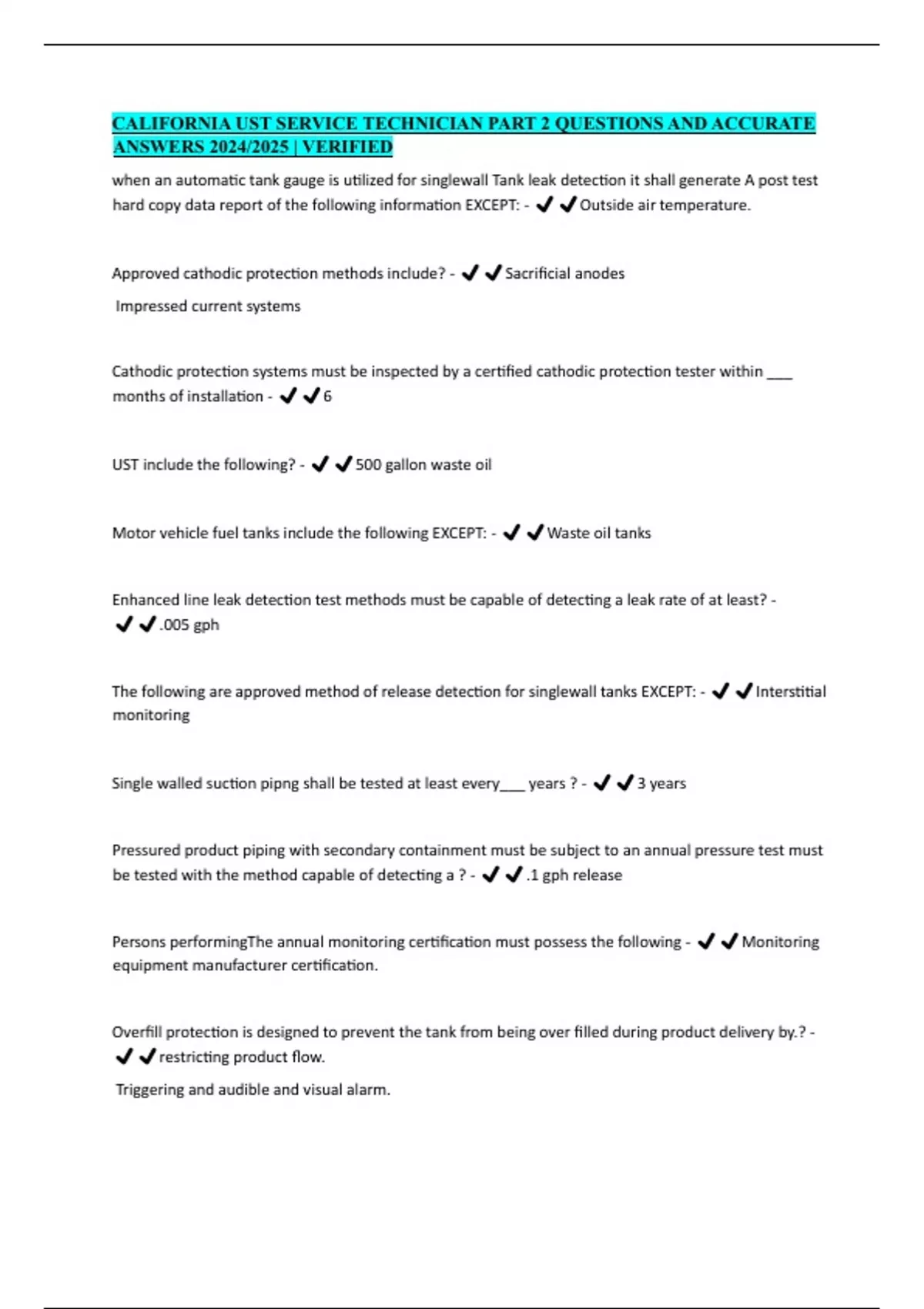 CALIFORNIA UST SERVICE TECHNICIAN PART 2 QUESTIONS AND ACCURATE ANSWERS 2024/2025 | VERIFIED