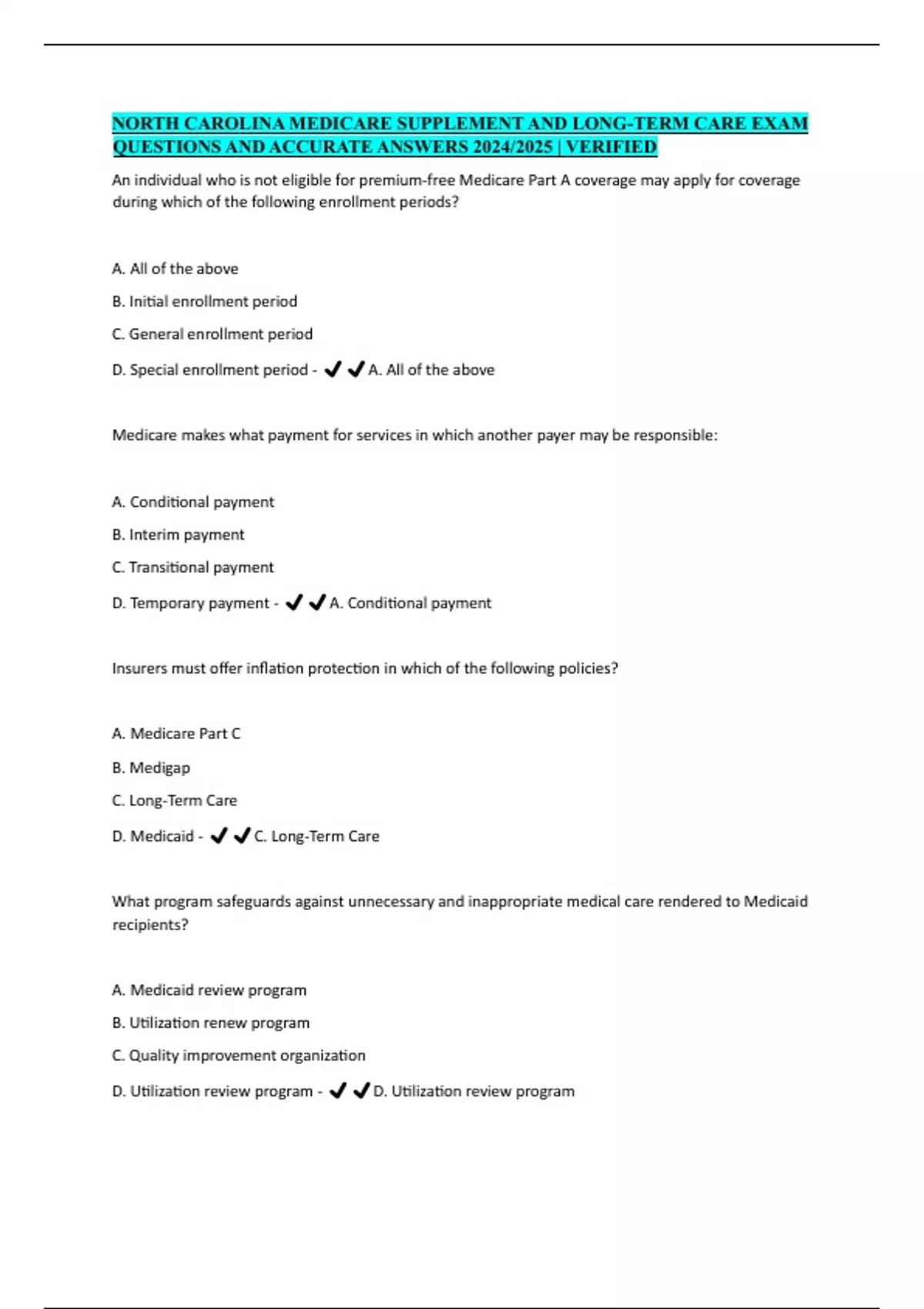 NORTH CAROLINA MEDICARE SUPPLEMENT AND LONG-TERM CARE EXAM QUESTIONS AND ACCURATE ANSWERS 2024/2025 | VERIFIED