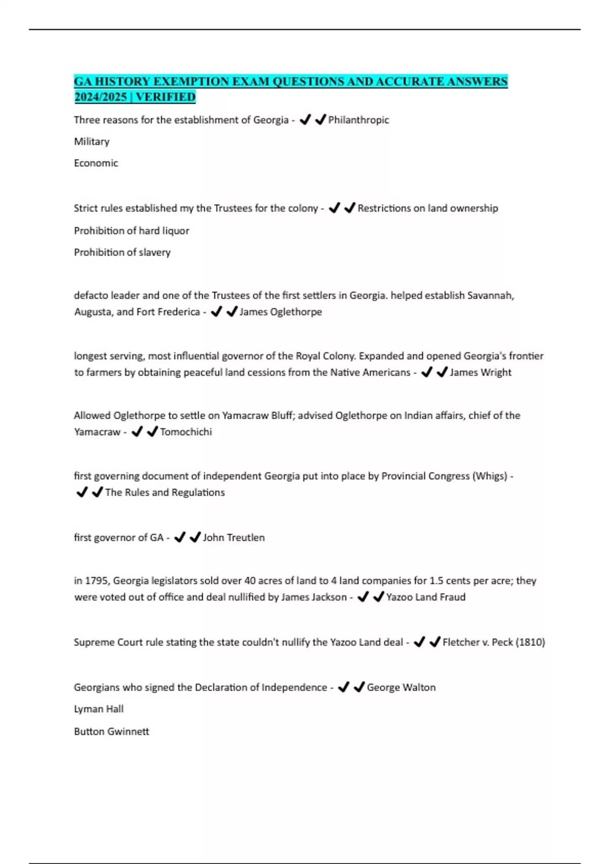 GA HISTORY EXEMPTION EXAM QUESTIONS AND ACCURATE ANSWERS
