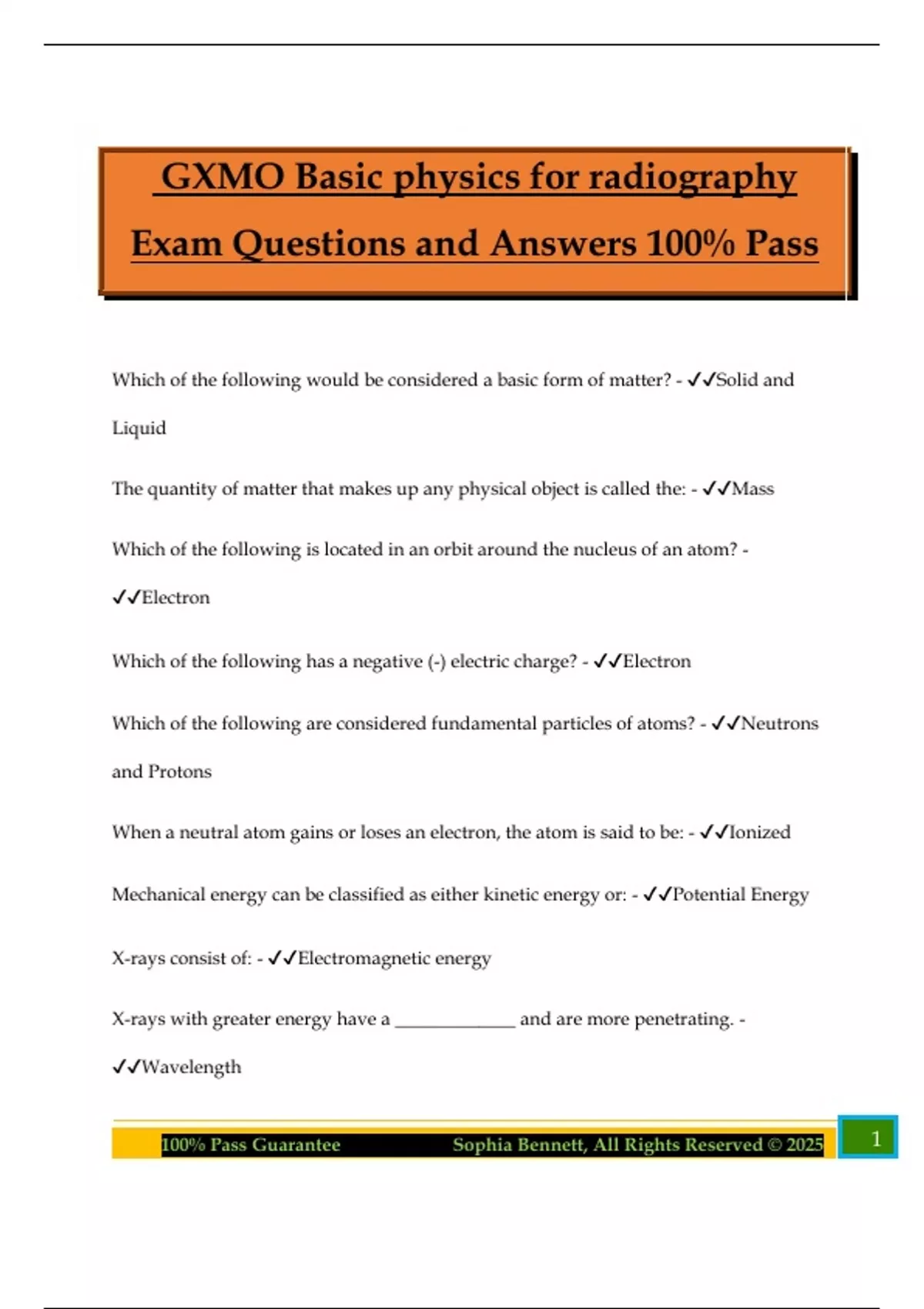 GXMO Basic physics for radiography Exam Questions and Answers 100% Pass Which of the following would be considered a basic form of matter? - Solid and Liquid The quantity of matter that makes up any physical object is called the: - Mass Which of the following is located in an orbit around the nucleus of an atom? - Electron Which of the following has a negative (-) electric charge? - Electron Which of the following are considered fundamental particles of atoms? - Neutrons and Protons When a neutral atom gains or loses an electron, the atom is said to be: - Ionized Mechanical energy can be classified as either kinetic energy or: - Potential Energy X-rays consist of: - Electromagnetic energy X-rays with greater energy have a _____________ and are more penetrating. - Wavelength