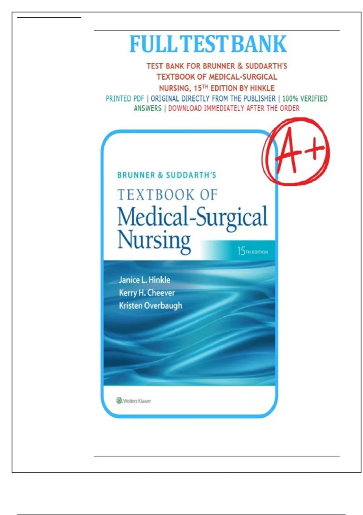 ******** INSTANT DOWNLOAD AS PDF FILE ******** Test Bank for Brunner & Suddarth's Textbook of Medical-Surgical Nursing, 15th Edition by Janice L Hinkle, Kerry H. Cheever, Et al. | 9781975161033 | | Chapter 1-68 | Complete Questions and Answers A+ Test Bank for Brunner & Suddarth's Textbook of Medical-Surgical Nursing, 15th Edition by Janice L Hinkle, Kerry H. Cheever, Et al. | 9781975161033 | | Chapter 1-68 | Complete Questions and Answers A+ Test Bank for Brunner & Suddarth's Textbook of Medical-Surgical Nursing, 15th Edition by Janice L Hinkle, Kerry H. Cheever, Et al. | 9781975161033 | | Chapter 1-68 | Complete Questions and Answers A+