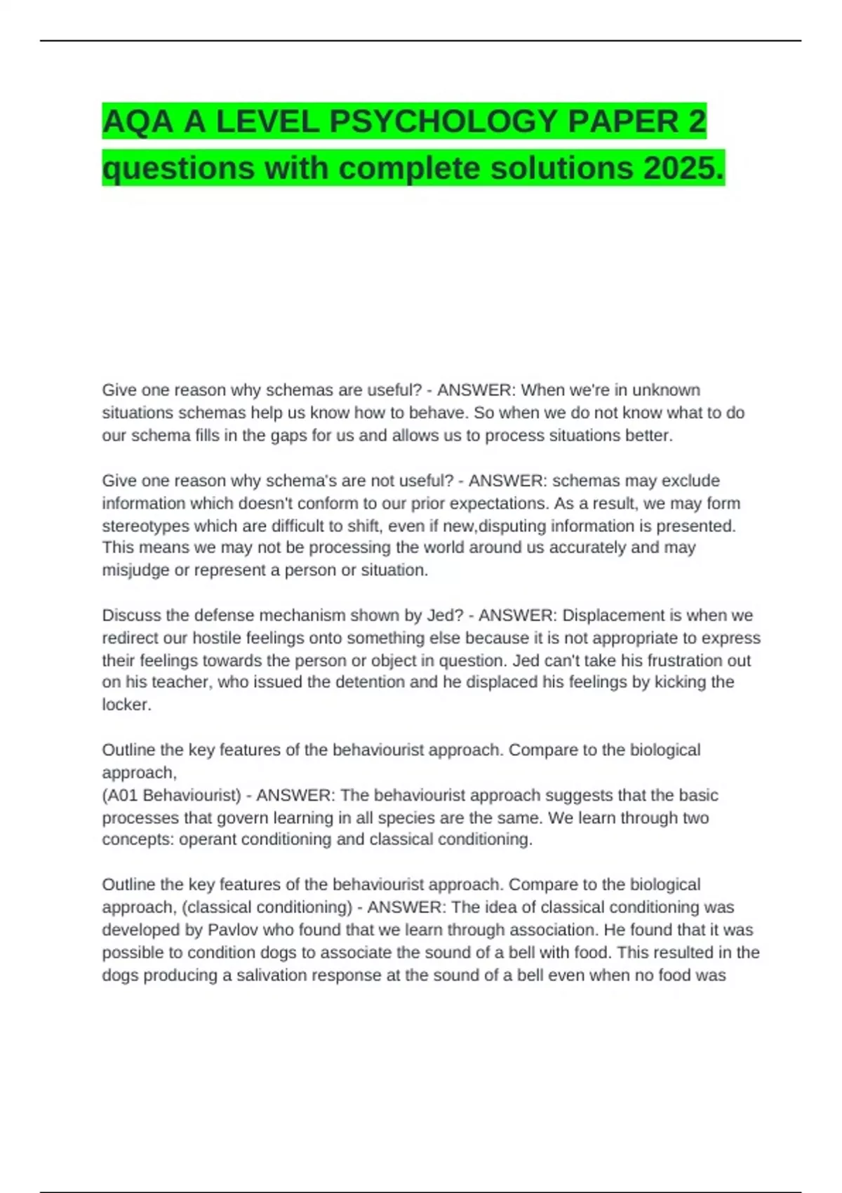 AQA A LEVEL PSYCHOLOGY PAPER 2 questions with complete solutions 2025