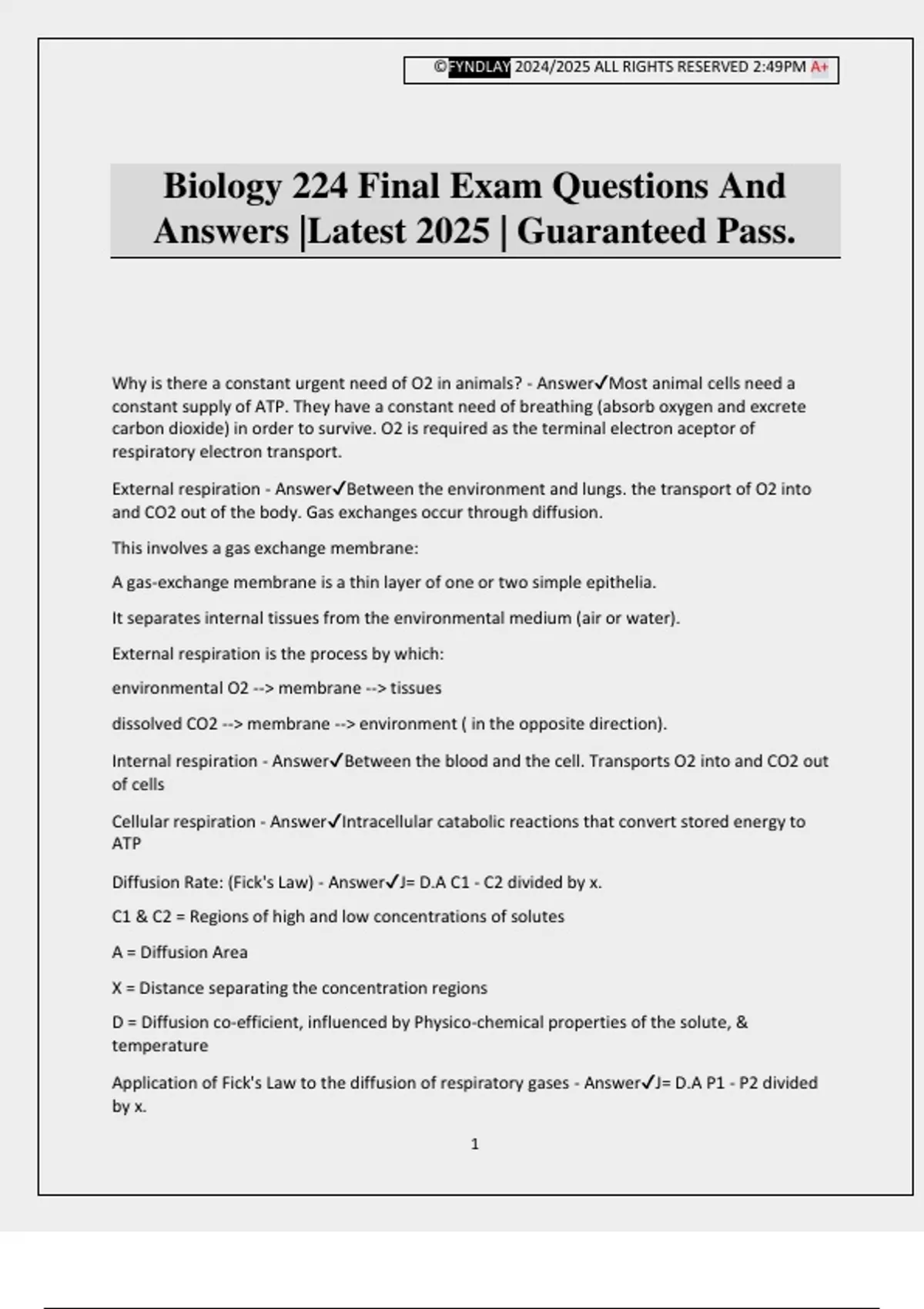 Application of Fick's Law to the diffusion of respiratory gases - Answer✔J= D.A P1 - P2 divided