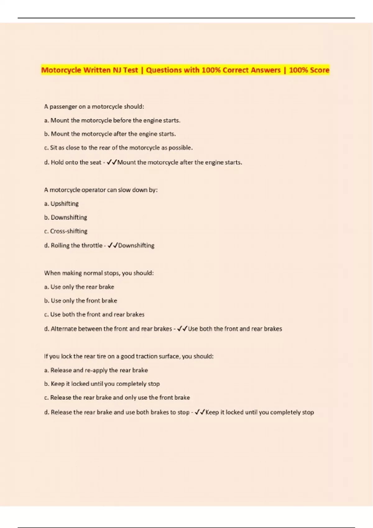 Package deal :::: Motorcycle Permit Tests 2025 with 100% Correct Answers