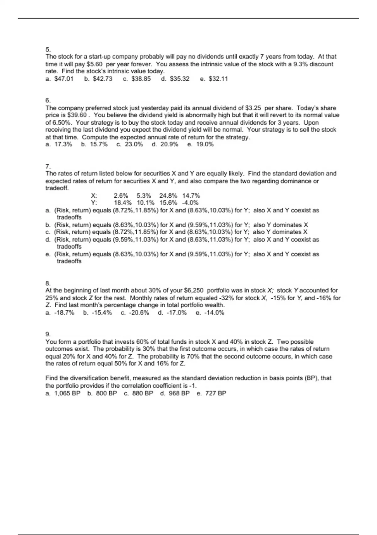 You form a portfolio that invests 60% of total funds in stock X and 40% in stock Z. Two possible